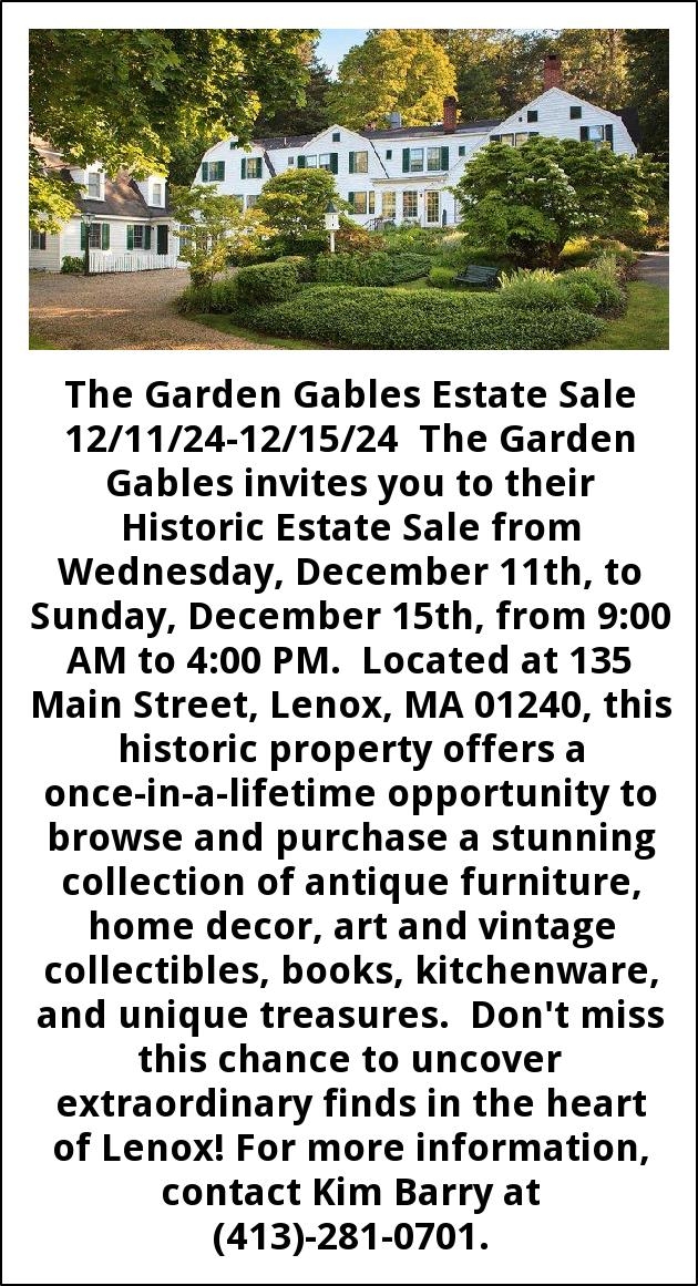 The Garden Gables Estate Sale 12/11/24-12/15/24 The Garden Gables invites you to their Historic Estate Sale from Wednesday, December 11th, to Sunday, December 15th, from 9:00 AM to 4:00 PM. Located at 135 Main Street, Lenox, MA 01240, this historic property offers a once-in-a-lifetime opportunity to browse and purchase a stunning collection of antique furniture, home decor, art and vintage collectibles, books, kitchenware, and unique treasures. Don't miss this chance to uncover extraordinary finds in the heart of Lenox! For more information, contact Kim Barry at (413)-281-0701.