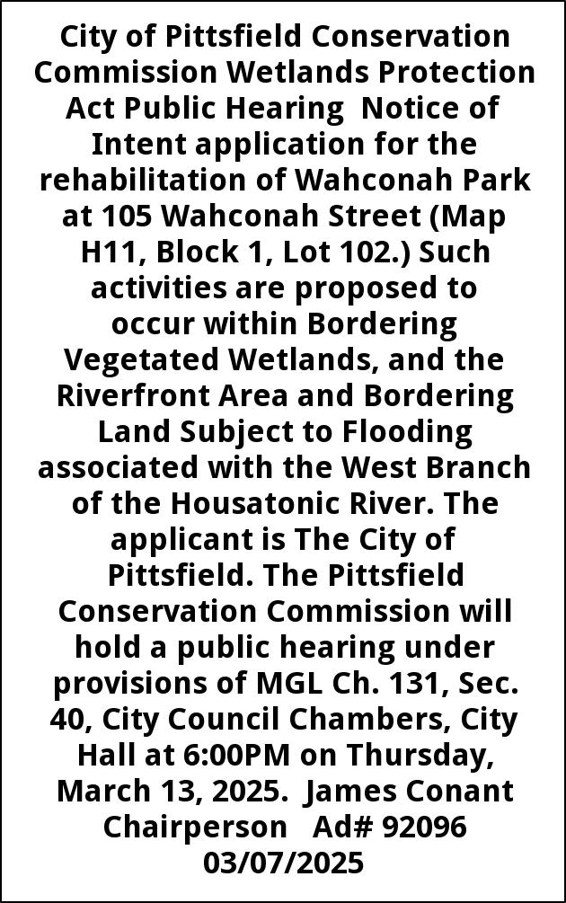 City of Pittsfield Conservation Commission Wetlands Protection Act Public Hearing Notice of Intent application for the rehabilitation of Wahconah Park at 105 Wahconah Street (Map H11, Block 1, Lot 102.) Such activities are proposed to occur within Bordering Vegetated Wetlands, and the Riverfront Area and Bordering Land Subject to Flooding associated with the West Branch of the Housatonic River. The applicant is The City of Pittsfield. The Pittsfield Conservation Commission will hold a public hearing under provisions of MGL Ch. 131, Sec. 40, City Council Chambers, City Hall at 6:00PM on Thursday, March 13, 2025. James Conant Chairperson Ad# 92096 03/07/2025