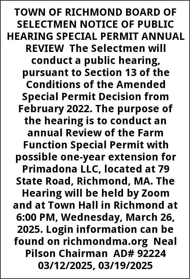 TOWN OF RICHMOND BOARD OF SELECTMEN NOTICE OF PUBLIC HEARING SPECIAL PERMIT ANNUAL REVIEW The Selectmen will conduct a public hearing, pursuant to Section 13 of the Conditions of the Amended Special Permit Decision from February 2022. The purpose of the hearing is to conduct an annual Review of the Farm Function Special Permit with possible one-year extension for Primadona LLC, located at 79 State Road, Richmond, MA. The Hearing will be held by Zoom and at Town Hall in Richmond at 6:00 PM, Wednesday, March 26, 2025. Login information can be found on richmondma.org Neal Pilson Chairman AD# 92224 03/12/2025, 03/19/2025
