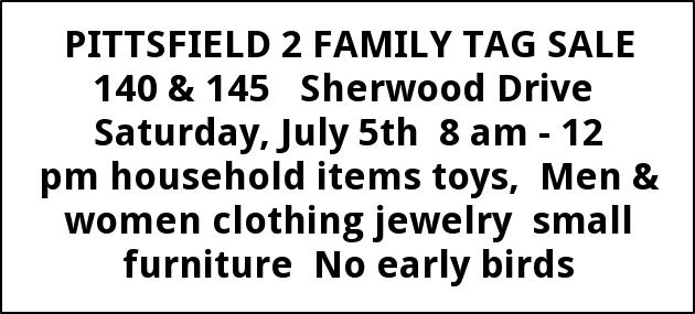 PITTSFIELD 2 FAMILY TAG SALE 140 & 145 Sherwood Drive Saturday, July 5th 8 am - 12 pm household items toys, Men & women clothing jewelry small furniture No early birds