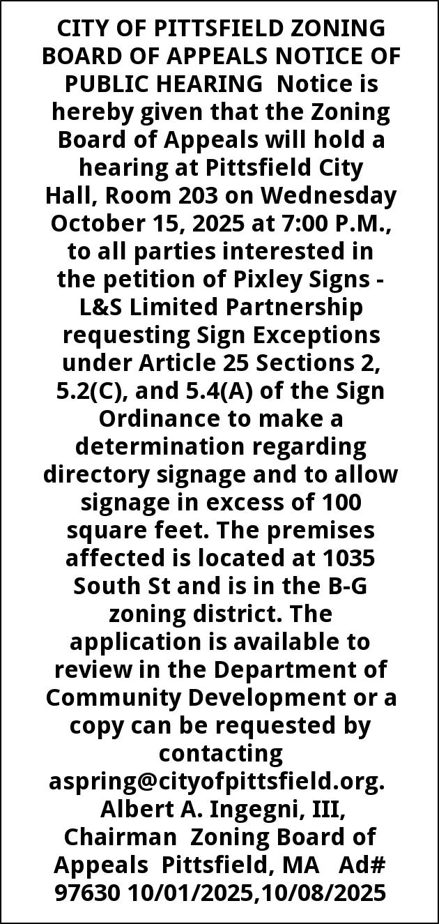 CITY OF PITTSFIELD ZONING BOARD OF APPEALS NOTICE OF PUBLIC HEARING Notice is hereby given that the Zoning Board of Appeals will hold a hearing at Pittsfield City Hall, Room 203 on Wednesday October 15, 2025 at 7:00 P.M., to all parties interested in the petition of Pixley Signs - L&S Limited Partnership requesting Sign Exceptions under Article 25 Sections 2, 5.2(C), and 5.4(A) of the Sign Ordinance to make a determination regarding directory signage and to allow signage in excess of 100 square feet. The premises affected is located at 1035 South St and is in the B-G zoning district. The application is available to review in the Department of Community Development or a copy can be requested by contacting aspring@cityofpittsfield.org. Albert A. Ingegni, III, Chairman Zoning Board of Appeals Pittsfield, MA Ad# 97630 10/01/2025,10/08/2025