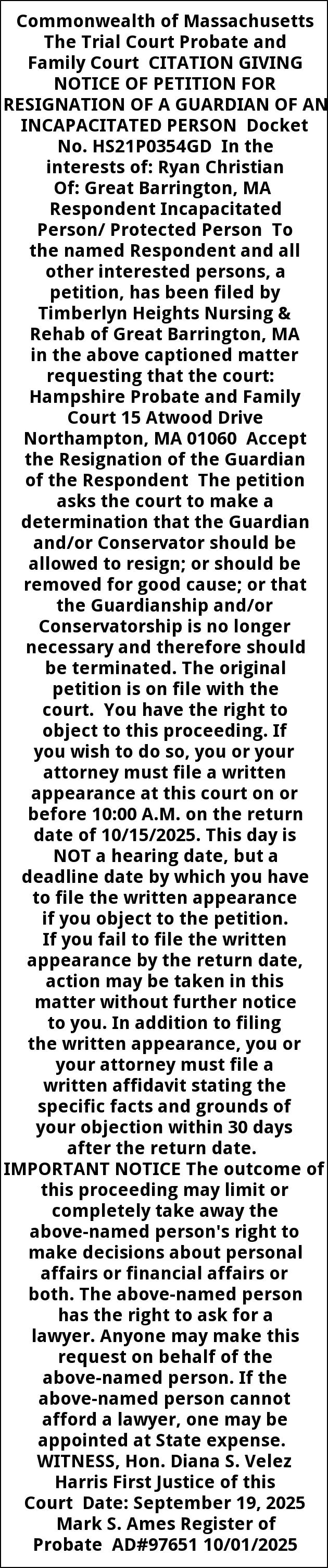 Commonwealth of Massachusetts The Trial Court Probate and Family Court CITATION GIVING NOTICE OF PETITION FOR RESIGNATION OF A GUARDIAN OF AN INCAPACITATED PERSON Docket No. HS21P0354GD In the interests of: Ryan Christian Of: Great Barrington, MA Respondent Incapacitated Person/ Protected Person To the named Respondent and all other interested persons, a petition, has been filed by Timberlyn Heights Nursing & Rehab of Great Barrington, MA in the above captioned matter requesting that the court: Hampshire Probate and Family Court 15 Atwood Drive Northampton, MA 01060 Accept the Resignation of the Guardian of the Respondent The petition asks the court to make a determination that the Guardian and/or Conservator should be allowed to resign; or should be removed for good cause; or that the Guardianship and/or Conservatorship is no longer necessary and therefore should be terminated. The original petition is on file with the court. You have the right to object to this proceeding. If you wish to do so, you or your attorney must file a written appearance at this court on or before 10:00 A.M. on the return date of 10/15/2025. This day is NOT a hearing date, but a deadline date by which you have to file the written appearance if you object to the petition. If you fail to file the written appearance by the return date, action may be taken in this matter without further notice to you. In addition to filing the written appearance, you or your attorney must file a written affidavit stating the specific facts and grounds of your objection within 30 days after the return date. IMPORTANT NOTICE The outcome of this proceeding may limit or completely take away the above-named person's right to make decisions about personal affairs or financial affairs or both. The above-named person has the right to ask for a lawyer. Anyone may make this request on behalf of the above-named person. If the above-named person cannot afford a lawyer, one may be appointed at State expense. WITNESS, Hon. Diana S. Velez Harris First Justice of this Court Date: September 19, 2025 Mark S. Ames Register of Probate AD#97651 10/01/2025