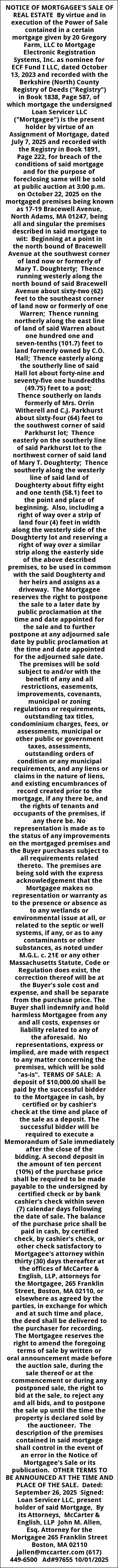 NOTICE OF MORTGAGEE'S SALE OF REAL ESTATE By virtue and in execution of the Power of Sale contained in a certain mortgage given by 20 Gregory Farm, LLC to Mortgage Electronic Registration Systems, Inc. as nominee for ECF Fund I LLC, dated October 13, 2023 and recorded with the Berkshire (North) County Registry of Deeds ("Registry") in Book 1838, Page 587, of which mortgage the undersigned Loan Servicer LLC ("Mortgagee") is the present holder by virtue of an Assignment of Mortgage, dated July 7, 2025 and recorded with the Registry in Book 1891, Page 222, for breach of the conditions of said mortgage and for the purpose of foreclosing same will be sold at public auction at 3:00 p.m. on October 22, 2025 on the mortgaged premises being known as 17-19 Bracewell Avenue, North Adams, MA 01247, being all and singular the premises described in said mortgage to wit: Beginning at a point in the north bound of Bracewell Avenue at the southwest corner of land now or formerly of Mary T. Doughterty; Thence running westerly along the north bound of said Bracewell Avenue about sixty-two (62) feet to the southeast corner of land now or formerly of one Warren; Thence running northerly along the east line of land of said Warren about one hundred one and seven-tenths (101.7) feet to land formerly owned by C.O. Hall; Thence easterly along the southerly line of said Hall lot about forty-nine and seventy-five one hundredths (49.75) feet to a post; Thence southerly on lands formerly of Mrs. Orrin Witherell and C.J. Parkhurst about sixty-four (64) feet to the southwest corner of said Parkhurst lot; Thence easterly on the southerly line of said Parkhurst lot to the northwest corner of said land of Mary T. Doughterty; Thence southerly along the westerly line of said land of Doughterty about fifty eight and one tenth (58.1) feet to the point and place of beginning. Also, including a right of way over a strip of land four (4) feet in width along the westerly side of the Doughterty lot and reserving a right of way over a similar strip along the easterly side of the above described premises, to be used in common with the said Doughterty and her heirs and assigns as a driveway. The Mortgagee reserves the right to postpone the sale to a later date by public proclamation at the time and date appointed for the sale and to further postpone at any adjourned sale date by public proclamation at the time and date appointed for the adjourned sale date. The premises will be sold subject to and/or with the benefit of any and all restrictions, easements, improvements, covenants, municipal or zoning regulations or requirements, outstanding tax titles, condominium charges, fees, or assessments, municipal or other public or government taxes, assessments, outstanding orders of condition or any municipal requirements, and any liens or claims in the nature of liens, and existing encumbrances of record created prior to the mortgage, if any there be, and the rights of tenants and occupants of the premises, if any there be. No representation is made as to the status of any improvements on the mortgaged premises and the Buyer purchases subject to all requirements related thereto. The premises are being sold with the express acknowledgement that the Mortgagee makes no representation or warranty as to the presence or absence as to any wetlands or environmental issue at all, or related to the septic or well systems, if any, or as to any contaminants or other substances, as noted under M.G.L. c. 21E or any other Massachusetts Statute, Code or Regulation does exist, the correction thereof will be at the Buyer's sole cost and expense, and shall be separate from the purchase price. The Buyer shall indemnify and hold harmless Mortgagee from any and all costs, expenses or liability related to any of the aforesaid. No representations, express or implied, are made with respect to any matter concerning the premises, which will be sold "as-is". TERMS OF SALE: A deposit of $10,000.00 shall be paid by the successful bidder to the Mortgagee in cash, by certified or by cashier's check at the time and place of the sale as a deposit. The successful bidder will be required to execute a Memorandum of Sale immediately after the close of the bidding. A second deposit in the amount of ten percent (10%) of the purchase price shall be required to be made payable to the undersigned by certified check or by bank cashier's check within seven (7) calendar days following the date of sale. The balance of the purchase price shall be paid in cash, by certified check, by cashier's check, or other check satisfactory to Mortgagee's attorney within thirty (30) days thereafter at the offices of McCarter & English, LLP, attorneys for the Mortgagee, 265 Franklin Street, Boston, MA 02110, or elsewhere as agreed by the parties, in exchange for which and at such time and place, the deed shall be delivered to the purchaser for recording. The Mortgagee reserves the right to amend the foregoing terms of sale by written or oral announcement made before the auction sale, during the sale thereof or at the commencement or during any postponed sale, the right to bid at the sale, to reject any and all bids, and to postpone the sale up until the time the property is declared sold by the auctioneer. The description of the premises contained in said mortgage shall control in the event of an error in the Notice of Mortgagee's Sale or its publication. OTHER TERMS TO BE ANNOUNCED AT THE TIME AND PLACE OF THE SALE. Dated: September 26, 2025 Signed: Loan Servicer LLC, present holder of said Mortgage, By its Attorneys, McCarter & English, LLP John M. Allen, Esq. Attorney for the Mortgagee 265 Franklin Street Boston, MA 02110 jallen@mccarter.com (617) 449-6500 Ad#97655 10/01/2025