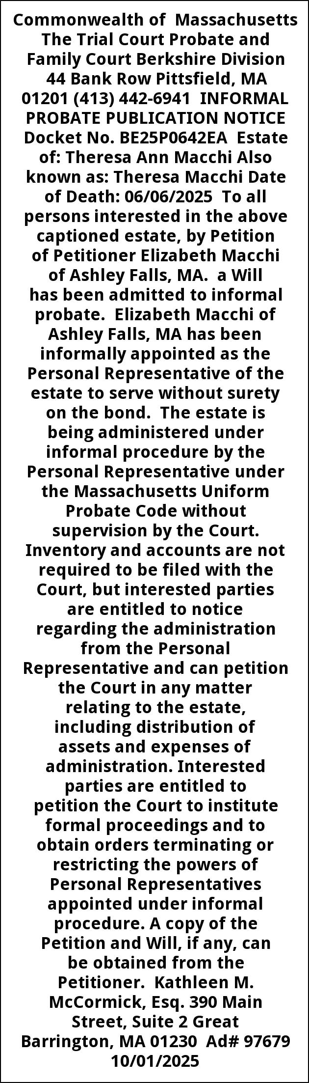 Commonwealth of Massachusetts The Trial Court Probate and Family Court Berkshire Division 44 Bank Row Pittsfield, MA 01201 (413) 442-6941 INFORMAL PROBATE PUBLICATION NOTICE Docket No. BE25P0642EA Estate of: Theresa Ann Macchi Also known as: Theresa Macchi Date of Death: 06/06/2025 To all persons interested in the above captioned estate, by Petition of Petitioner Elizabeth Macchi of Ashley Falls, MA. a Will has been admitted to informal probate. Elizabeth Macchi of Ashley Falls, MA has been informally appointed as the Personal Representative of the estate to serve without surety on the bond. The estate is being administered under informal procedure by the Personal Representative under the Massachusetts Uniform Probate Code without supervision by the Court. Inventory and accounts are not required to be filed with the Court, but interested parties are entitled to notice regarding the administration from the Personal Representative and can petition the Court in any matter relating to the estate, including distribution of assets and expenses of administration. Interested parties are entitled to petition the Court to institute formal proceedings and to obtain orders terminating or restricting the powers of Personal Representatives appointed under informal procedure. A copy of the Petition and Will, if any, can be obtained from the Petitioner. Kathleen M. McCormick, Esq. 390 Main Street, Suite 2 Great Barrington, MA 01230 Ad# 97679 10/01/2025