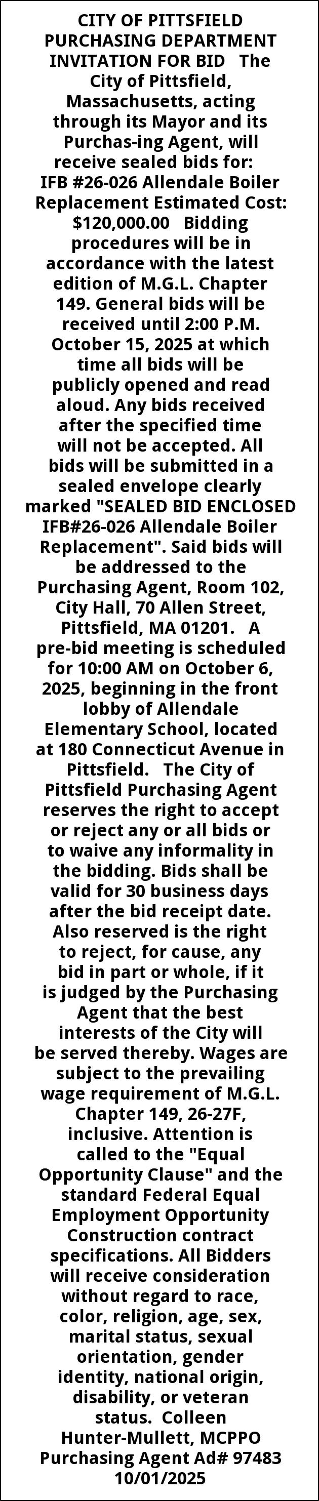 CITY OF PITTSFIELD PURCHASING DEPARTMENT INVITATION FOR BID The City of Pittsfield, Massachusetts, acting through its Mayor and its Purchas-ing Agent, will receive sealed bids for: IFB #26-026 Allendale Boiler Replacement Estimated Cost: $120,000.00 Bidding procedures will be in accordance with the latest edition of M.G.L. Chapter 149. General bids will be received until 2:00 P.M. October 15, 2025 at which time all bids will be publicly opened and read aloud. Any bids received after the specified time will not be accepted. All bids will be submitted in a sealed envelope clearly marked "SEALED BID ENCLOSED IFB#26-026 Allendale Boiler Replacement". Said bids will be addressed to the Purchasing Agent, Room 102, City Hall, 70 Allen Street, Pittsfield, MA 01201. A pre-bid meeting is scheduled for 10:00 AM on October 6, 2025, beginning in the front lobby of Allendale Elementary School, located at 180 Connecticut Avenue in Pittsfield. The City of Pittsfield Purchasing Agent reserves the right to accept or reject any or all bids or to waive any informality in the bidding. Bids shall be valid for 30 business days after the bid receipt date. Also reserved is the right to reject, for cause, any bid in part or whole, if it is judged by the Purchasing Agent that the best interests of the City will be served thereby. Wages are subject to the prevailing wage requirement of M.G.L. Chapter 149, 26-27F, inclusive. Attention is called to the "Equal Opportunity Clause" and the standard Federal Equal Employment Opportunity Construction contract specifications. All Bidders will receive consideration without regard to race, color, religion, age, sex, marital status, sexual orientation, gender identity, national origin, disability, or veteran status. Colleen Hunter-Mullett, MCPPO Purchasing Agent Ad# 97483 10/01/2025