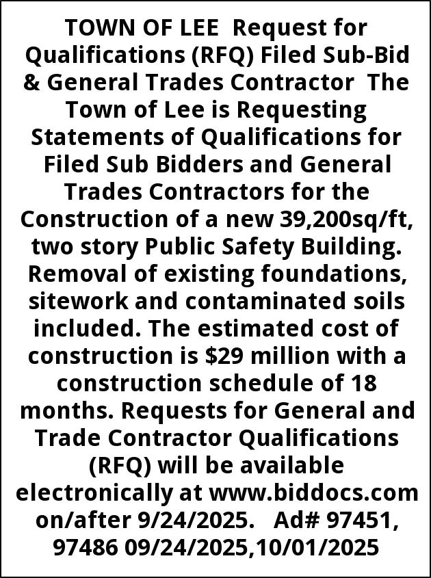 TOWN OF LEE Request for Qualifications (RFQ) Filed Sub-Bid & General Trades Contractor The Town of Lee is Requesting Statements of Qualifications for Filed Sub Bidders and General Trades Contractors for the Construction of a new 39,200sq/ft, two story Public Safety Building. Removal of existing foundations, sitework and contaminated soils included. The estimated cost of construction is $29 million with a construction schedule of 18 months. Requests for General and Trade Contractor Qualifications (RFQ) will be available electronically at www.biddocs.com on/after 9/24/2025. Ad# 97451, 97486 09/24/2025,10/01/2025