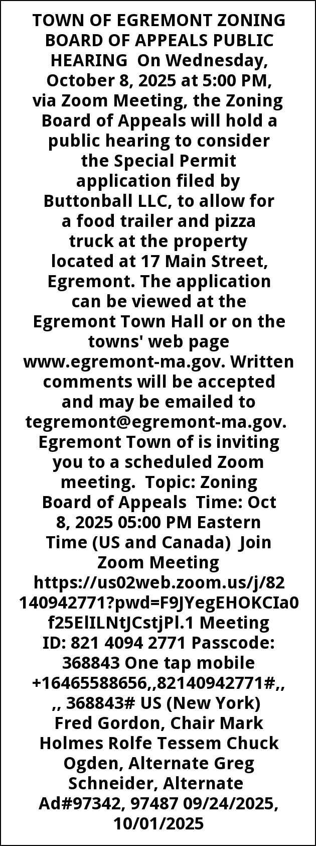 TOWN OF EGREMONT ZONING BOARD OF APPEALS PUBLIC HEARING On Wednesday, October 8, 2025 at 5:00 PM, via Zoom Meeting, the Zoning Board of Appeals will hold a public hearing to consider the Special Permit application filed by Buttonball LLC, to allow for a food trailer and pizza truck at the property located at 17 Main Street, Egremont. The application can be viewed at the Egremont Town Hall or on the towns' web page www.egremont-ma.gov. Written comments will be accepted and may be emailed to tegremont@egremont-ma.gov. Egremont Town of is inviting you to a scheduled Zoom meeting. Topic: Zoning Board of Appeals Time: Oct 8, 2025 05:00 PM Eastern Time (US and Canada) Join Zoom Meeting https://us02web.zoom.us/j/82140942771?pwd=F9JYegEHOKCIa0f25ElILNtJCstjPl.1 Meeting ID: 821 4094 2771 Passcode: 368843 One tap mobile +16465588656,,82140942771#,,,, 368843# US (New York) Fred Gordon, Chair Mark Holmes Rolfe Tessem Chuck Ogden, Alternate Greg Schneider, Alternate Ad#97342, 97487 09/24/2025, 10/01/2025