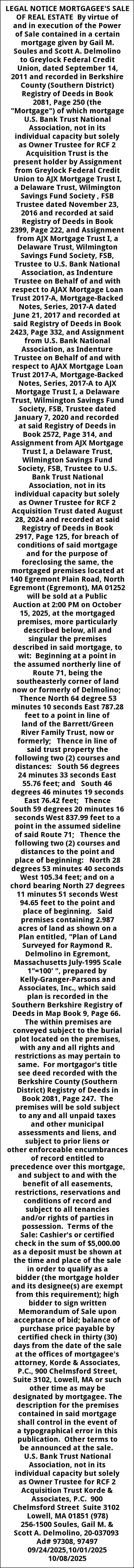 LEGAL NOTICE MORTGAGEE'S SALE OF REAL ESTATE By virtue of and in execution of the Power of Sale contained in a certain mortgage given by Gail M. Soules and Scott A. Delmolino to Greylock Federal Credit Union, dated September 14, 2011 and recorded in Berkshire County (Southern District) Registry of Deeds in Book 2081, Page 250 (the "Mortgage") of which mortgage U.S. Bank Trust National Association, not in its individual capacity but solely as Owner Trustee for RCF 2 Acquisition Trust is the present holder by Assignment from Greylock Federal Credit Union to AJX Mortgage Trust I, a Delaware Trust, Wilmington Savings Fund Society , FSB Trustee dated November 23, 2016 and recorded at said Registry of Deeds in Book 2399, Page 222, and Assignment from AJX Mortgage Trust I, a Delaware Trust, Wilmington Savings Fund Society, FSB, Trustee to U.S. Bank National Association, as Indenture Trustee on Behalf of and with respect to AJAX Mortgage Loan Trust 2017-A, Mortgage-Backed Notes, Series, 2017-A dated June 21, 2017 and recorded at said Registry of Deeds in Book 2423, Page 332, and Assignment from U.S. Bank National Association, as Indenture Trustee on Behalf of and with respect to AJAX Mortgage Loan Trust 2017-A, Mortgage-Backed Notes, Series, 2017-A to AJX Mortgage Trust I, a Delaware Trust, Wilmington Savings Fund Society, FSB, Trustee dated January 7, 2020 and recorded at said Registry of Deeds in Book 2572, Page 314, and Assignment from AJX Mortgage Trust I, a Delaware Trust, Wilmington Savings Fund Society, FSB, Trustee to U.S. Bank Trust National Association, not in its individual capacity but solely as Owner Trustee for RCF 2 Acquisition Trust dated August 28, 2024 and recorded at said Registry of Deeds in Book 2917, Page 125, for breach of conditions of said mortgage and for the purpose of foreclosing the same, the mortgaged premises located at 140 Egremont Plain Road, North Egremont (Egremont), MA 01252 will be sold at a Public Auction at 2:00 PM on October 15, 2025, at the mortgaged premises, more particularly described below, all and singular the premises described in said mortgage, to wit: Beginning at a point in the assumed northerly line of Route 71, being the southeasterly corner of land now or formerly of Delmolino; Thence North 64 degree 53 minutes 10 seconds East 787.28 feet to a point in line of land of the Barrett/Green River Family Trust, now or formerly; Thence in line of said trust property the following two (2) courses and distances: South 56 degrees 24 minutes 33 seconds East 55.76 feet; and South 46 degrees 46 minutes 19 seconds East 76.42 feet; Thence South 59 degrees 20 minutes 16 seconds West 837.99 feet to a point in the assumed sideline of said Route 71; Thence the following two (2) courses and distances to the point and place of beginning: North 28 degrees 53 minutes 40 seconds West 105.34 feet; and on a chord bearing North 27 degrees 11 minutes 51 seconds West 94.65 feet to the point and place of beginning. Said premises containing 2.987 acres of land as shown on a Plan entitled, "Plan of Land Surveyed for Raymond R. Delmolino in Egremont, Massachusetts July-1995 Scale 1"=100' ", prepared by Kelly-Granger-Parsons and Associates, Inc., which said plan is recorded in the Southern Berkshire Registry of Deeds in Map Book 9, Page 66. The within premises are conveyed subject to the burial plot located on the premises, with any and all rights and restrictions as may pertain to same. For mortgagor's title see deed recorded with the Berkshire County (Southern District) Registry of Deeds in Book 2081, Page 247. The premises will be sold subject to any and all unpaid taxes and other municipal assessments and liens, and subject to prior liens or other enforceable encumbrances of record entitled to precedence over this mortgage, and subject to and with the benefit of all easements, restrictions, reservations and conditions of record and subject to all tenancies and/or rights of parties in possession. Terms of the Sale: Cashier's or certified check in the sum of $5,000.00 as a deposit must be shown at the time and place of the sale in order to qualify as a bidder (the mortgage holder and its designee(s) are exempt from this requirement); high bidder to sign written Memorandum of Sale upon acceptance of bid; balance of purchase price payable by certified check in thirty (30) days from the date of the sale at the offices of mortgagee's attorney, Korde & Associates, P.C., 900 Chelmsford Street, Suite 3102, Lowell, MA or such other time as may be designated by mortgagee. The description for the premises contained in said mortgage shall control in the event of a typographical error in this publication. Other terms to be announced at the sale. U.S. Bank Trust National Association, not in its individual capacity but solely as Owner Trustee for RCF 2 Acquisition Trust Korde & Associates, P.C. 900 Chelmsford Street Suite 3102 Lowell, MA 01851 (978) 256-1500 Soules, Gail M. & Scott A. Delmolino, 20-037093 Ad# 97308, 97497 09/24/2025,10/01/2025 10/08/2025