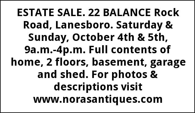 ESTATE SALE. 22 BALANCE Rock Road, Lanesboro. Saturday & Sunday, October 4th & 5th, 9a.m.-4p.m. Full contents of home, 2 floors, basement, garage and shed. For photos & descriptions visit www.norasantiques.com