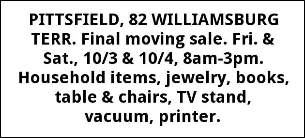 PITTSFIELD, 82 WILLIAMSBURG TERR. Final moving sale. Fri. & Sat., 10/3 & 10/4, 8am-3pm. Household items, jewelry, books, table & chairs, TV stand, vacuum, printer.