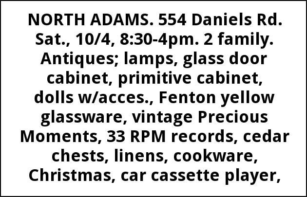 NORTH ADAMS. 554 Daniels Rd. Sat., 10/4, 8:30-4pm. 2 family. Antiques; lamps, glass door cabinet, primitive cabinet, dolls w/acces., Fenton yellow glassware, vintage Precious Moments, 33 RPM records, cedar chests, linens, cookware, Christmas, car cassette player,