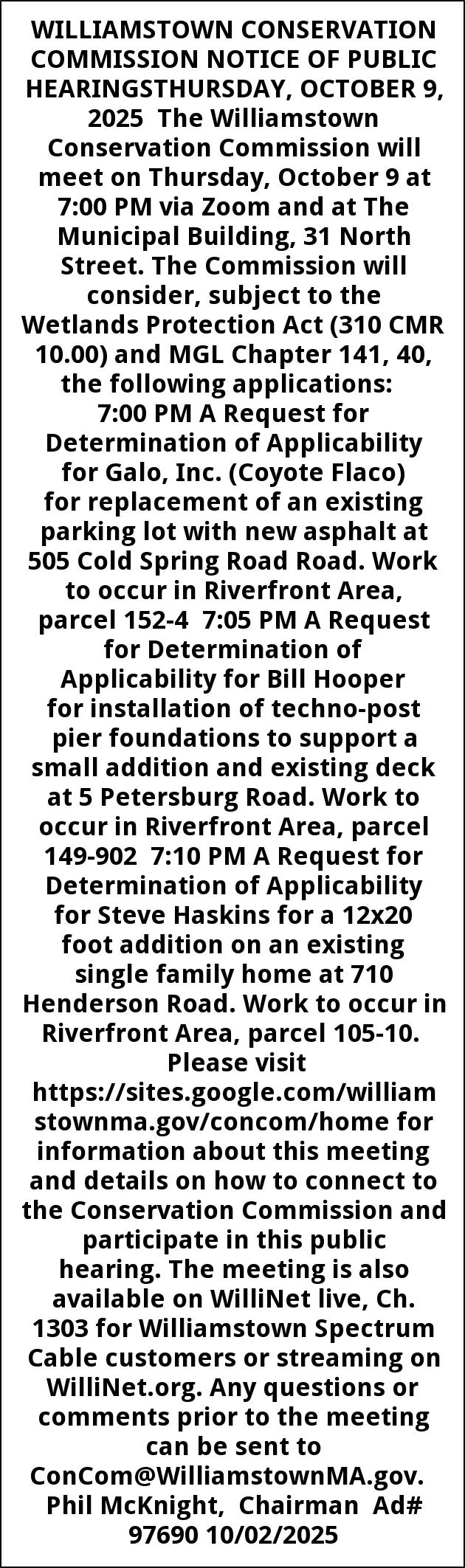 WILLIAMSTOWN CONSERVATION COMMISSION NOTICE OF PUBLIC HEARINGSTHURSDAY, OCTOBER 9, 2025 The Williamstown Conservation Commission will meet on Thursday, October 9 at 7:00 PM via Zoom and at The Municipal Building, 31 North Street. The Commission will consider, subject to the Wetlands Protection Act (310 CMR 10.00) and MGL Chapter 141, 40, the following applications: 7:00 PM A Request for Determination of Applicability for Galo, Inc. (Coyote Flaco) for replacement of an existing parking lot with new asphalt at 505 Cold Spring Road Road. Work to occur in Riverfront Area, parcel 152-4 7:05 PM A Request for Determination of Applicability for Bill Hooper for installation of techno-post pier foundations to support a small addition and existing deck at 5 Petersburg Road. Work to occur in Riverfront Area, parcel 149-902 7:10 PM A Request for Determination of Applicability for Steve Haskins for a 12x20 foot addition on an existing single family home at 710 Henderson Road. Work to occur in Riverfront Area, parcel 105-10. Please visit https://sites.google.com/williamstownma.gov/concom/home for information about this meeting and details on how to connect to the Conservation Commission and participate in this public hearing. The meeting is also available on WilliNet live, Ch. 1303 for Williamstown Spectrum Cable customers or streaming on WilliNet.org. Any questions or comments prior to the meeting can be sent to ConCom@WilliamstownMA.gov. Phil McKnight, Chairman Ad# 97690 10/02/2025