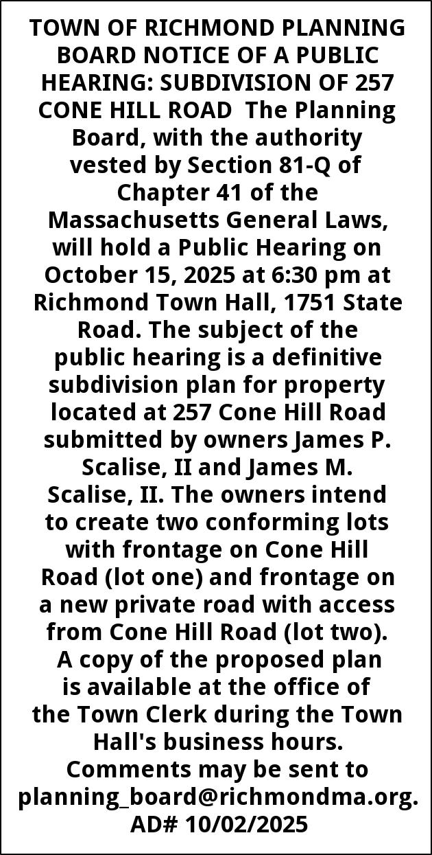 TOWN OF RICHMOND PLANNING BOARD NOTICE OF A PUBLIC HEARING: SUBDIVISION OF 257 CONE HILL ROAD The Planning Board, with the authority vested by Section 81-Q of Chapter 41 of the Massachusetts General Laws, will hold a Public Hearing on October 15, 2025 at 6:30 pm at Richmond Town Hall, 1751 State Road. The subject of the public hearing is a definitive subdivision plan for property located at 257 Cone Hill Road submitted by owners James P. Scalise, II and James M. Scalise, II. The owners intend to create two conforming lots with frontage on Cone Hill Road (lot one) and frontage on a new private road with access from Cone Hill Road (lot two). A copy of the proposed plan is available at the office of the Town Clerk during the Town Hall's business hours. Comments may be sent to planning_board@richmondma.org. AD# 10/02/2025