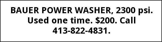 BAUER POWER WASHER, 2300 psi. Used one time. $200. Call 413-822-4831.