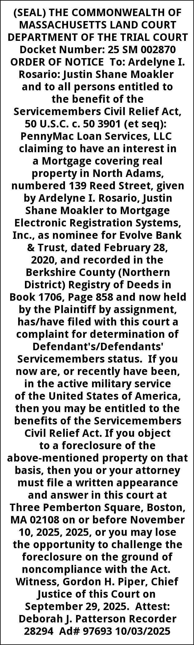 (SEAL) THE COMMONWEALTH OF MASSACHUSETTS LAND COURT DEPARTMENT OF THE TRIAL COURT Docket Number: 25 SM 002870 ORDER OF NOTICE To: Ardelyne I. Rosario: Justin Shane Moakler and to all persons entitled to the benefit of the Servicemembers Civil Relief Act, 50 U.S.C. c. 50 3901 (et seq): PennyMac Loan Services, LLC claiming to have an interest in a Mortgage covering real property in North Adams, numbered 139 Reed Street, given by Ardelyne I. Rosario, Justin Shane Moakler to Mortgage Electronic Registration Systems, Inc., as nominee for Evolve Bank & Trust, dated February 28, 2020, and recorded in the Berkshire County (Northern District) Registry of Deeds in Book 1706, Page 858 and now held by the Plaintiff by assignment, has/have filed with this court a complaint for determination of Defendant's/Defendants' Servicemembers status. If you now are, or recently have been, in the active military service of the United States of America, then you may be entitled to the benefits of the Servicemembers Civil Relief Act. If you object to a foreclosure of the above-mentioned property on that basis, then you or your attorney must file a written appearance and answer in this court at Three Pemberton Square, Boston, MA 02108 on or before November 10, 2025, 2025, or you may lose the opportunity to challenge the foreclosure on the ground of noncompliance with the Act. Witness, Gordon H. Piper, Chief Justice of this Court on September 29, 2025. Attest: Deborah J. Patterson Recorder 28294 Ad# 97693 10/03/2025