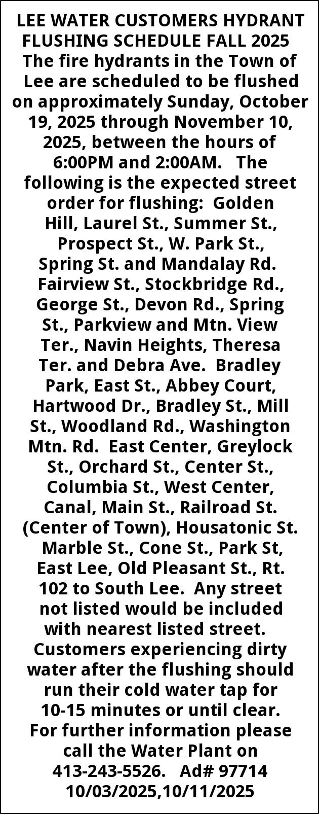 LEE WATER CUSTOMERS HYDRANT FLUSHING SCHEDULE FALL 2025 The fire hydrants in the Town of Lee are scheduled to be flushed on approximately Sunday, October 19, 2025 through November 10, 2025, between the hours of 6:00PM and 2:00AM. The following is the expected street order for flushing: Golden Hill, Laurel St., Summer St., Prospect St., W. Park St., Spring St. and Mandalay Rd. Fairview St., Stockbridge Rd., George St., Devon Rd., Spring St., Parkview and Mtn. View Ter., Navin Heights, Theresa Ter. and Debra Ave. Bradley Park, East St., Abbey Court, Hartwood Dr., Bradley St., Mill St., Woodland Rd., Washington Mtn. Rd. East Center, Greylock St., Orchard St., Center St., Columbia St., West Center, Canal, Main St., Railroad St. (Center of Town), Housatonic St. Marble St., Cone St., Park St, East Lee, Old Pleasant St., Rt. 102 to South Lee. Any street not listed would be included with nearest listed street. Customers experiencing dirty water after the flushing should run their cold water tap for 10-15 minutes or until clear. For further information please call the Water Plant on 413-243-5526. Ad# 97714 10/03/2025,10/11/2025