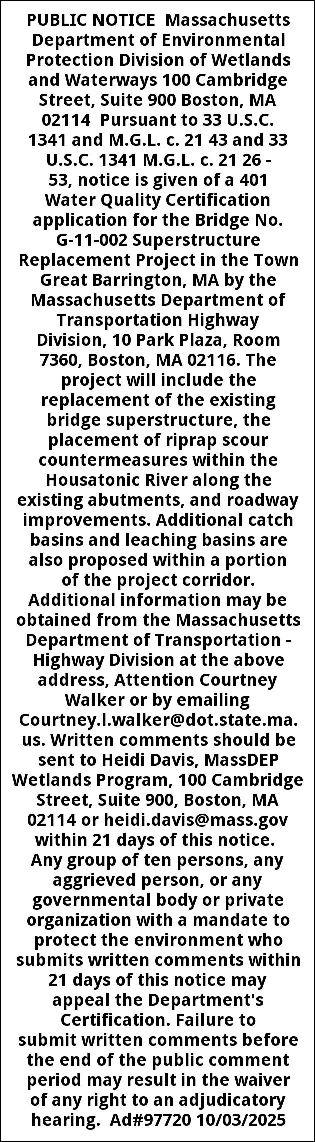 PUBLIC NOTICE Massachusetts Department of Environmental Protection Division of Wetlands and Waterways 100 Cambridge Street, Suite 900 Boston, MA 02114 Pursuant to 33 U.S.C. 1341 and M.G.L. c. 21 43 and 33 U.S.C. 1341 M.G.L. c. 21 26 - 53, notice is given of a 401 Water Quality Certification application for the Bridge No. G-11-002 Superstructure Replacement Project in the Town Great Barrington, MA by the Massachusetts Department of Transportation Highway Division, 10 Park Plaza, Room 7360, Boston, MA 02116. The project will include the replacement of the existing bridge superstructure, the placement of riprap scour countermeasures within the Housatonic River along the existing abutments, and roadway improvements. Additional catch basins and leaching basins are also proposed within a portion of the project corridor. Additional information may be obtained from the Massachusetts Department of Transportation - Highway Division at the above address, Attention Courtney Walker or by emailing Courtney.l.walker@dot.state.ma.us. Written comments should be sent to Heidi Davis, MassDEP Wetlands Program, 100 Cambridge Street, Suite 900, Boston, MA 02114 or heidi.davis@mass.gov within 21 days of this notice. Any group of ten persons, any aggrieved person, or any governmental body or private organization with a mandate to protect the environment who submits written comments within 21 days of this notice may appeal the Department's Certification. Failure to submit written comments before the end of the public comment period may result in the waiver of any right to an adjudicatory hearing. Ad#97720 10/03/2025