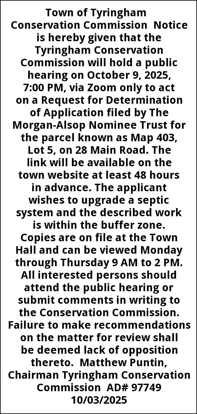Town of Tyringham Conservation Commission Notice is hereby given that the Tyringham Conservation Commission will hold a public hearing on October 9, 2025, 7:00 PM, via Zoom only to act on a Request for Determination of Application filed by The Morgan-Alsop Nominee Trust for the parcel known as Map 403, Lot 5, on 28 Main Road. The link will be available on the town website at least 48 hours in advance. The applicant wishes to upgrade a septic system and the described work is within the buffer zone. Copies are on file at the Town Hall and can be viewed Monday through Thursday 9 AM to 2 PM. All interested persons should attend the public hearing or submit comments in writing to the Conservation Commission. Failure to make recommendations on the matter for review shall be deemed lack of opposition thereto. Matthew Puntin, Chairman Tyringham Conservation Commission AD# 97749 10/03/2025