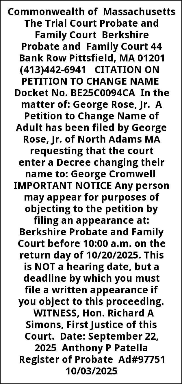 Commonwealth of Massachusetts The Trial Court Probate and Family Court Berkshire Probate and Family Court 44 Bank Row Pittsfield, MA 01201 (413)442-6941 CITATION ON PETITION TO CHANGE NAME Docket No. BE25C0094CA In the matter of: George Rose, Jr. A Petition to Change Name of Adult has been filed by George Rose, Jr. of North Adams MA requesting that the court enter a Decree changing their name to: George Cromwell IMPORTANT NOTICE Any person may appear for purposes of objecting to the petition by filing an appearance at: Berkshire Probate and Family Court before 10:00 a.m. on the return day of 10/20/2025. This is NOT a hearing date, but a deadline by which you must file a written appearance if you object to this proceeding. WITNESS, Hon. Richard A Simons, First Justice of this Court. Date: September 22, 2025 Anthony P Patella Register of Probate Ad#97751 10/03/2025