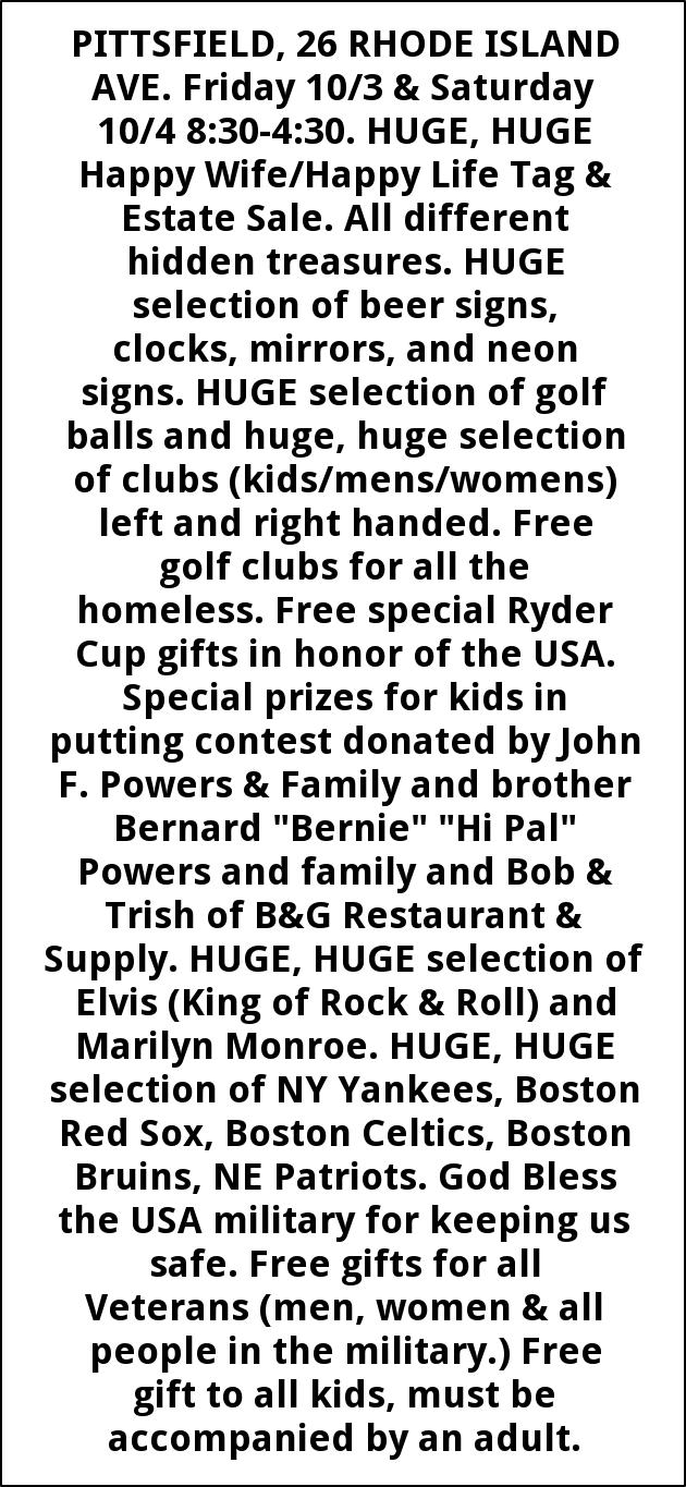 PITTSFIELD, 26 RHODE ISLAND AVE. Friday 10/3 & Saturday 10/4 8:30-4:30. HUGE, HUGE Happy Wife/Happy Life Tag & Estate Sale. All different hidden treasures. HUGE selection of beer signs, clocks, mirrors, and neon signs. HUGE selection of golf balls and huge, huge selection of clubs (kids/mens/womens) left and right handed. Free golf clubs for all the homeless. Free special Ryder Cup gifts in honor of the USA. Special prizes for kids in putting contest donated by John F. Powers & Family and brother Bernard "Bernie" "Hi Pal" Powers and family and Bob & Trish of B&G Restaurant & Supply. HUGE, HUGE selection of Elvis (King of Rock & Roll) and Marilyn Monroe. HUGE, HUGE selection of NY Yankees, Boston Red Sox, Boston Celtics, Boston Bruins, NE Patriots. God Bless the USA military for keeping us safe. Free gifts for all Veterans (men, women & all people in the military.) Free gift to all kids, must be accompanied by an adult.