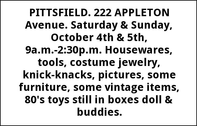 PITTSFIELD. 222 APPLETON Avenue. Saturday & Sunday, October 4th & 5th, 9a.m.-2:30p.m. Housewares, tools, costume jewelry, knick-knacks, pictures, some furniture, some vintage items, 80's toys still in boxes doll & buddies.
