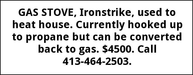 GAS STOVE, Ironstrike, used to heat house. Currently hooked up to propane but can be converted back to gas. $4500. Call 413-464-2503.