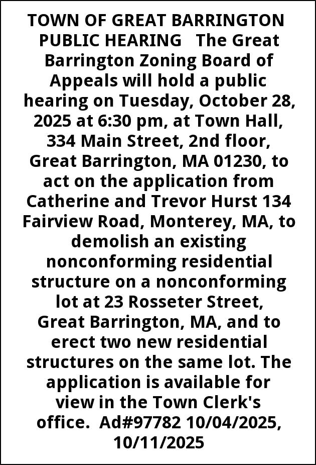 TOWN OF GREAT BARRINGTON PUBLIC HEARING The Great Barrington Zoning Board of Appeals will hold a public hearing on Tuesday, October 28, 2025 at 6:30 pm, at Town Hall, 334 Main Street, 2nd floor, Great Barrington, MA 01230, to act on the application from Catherine and Trevor Hurst 134 Fairview Road, Monterey, MA, to demolish an existing nonconforming residential structure on a nonconforming lot at 23 Rosseter Street, Great Barrington, MA, and to erect two new residential structures on the same lot. The application is available for view in the Town Clerk's office. Ad#97782 10/04/2025, 10/11/2025