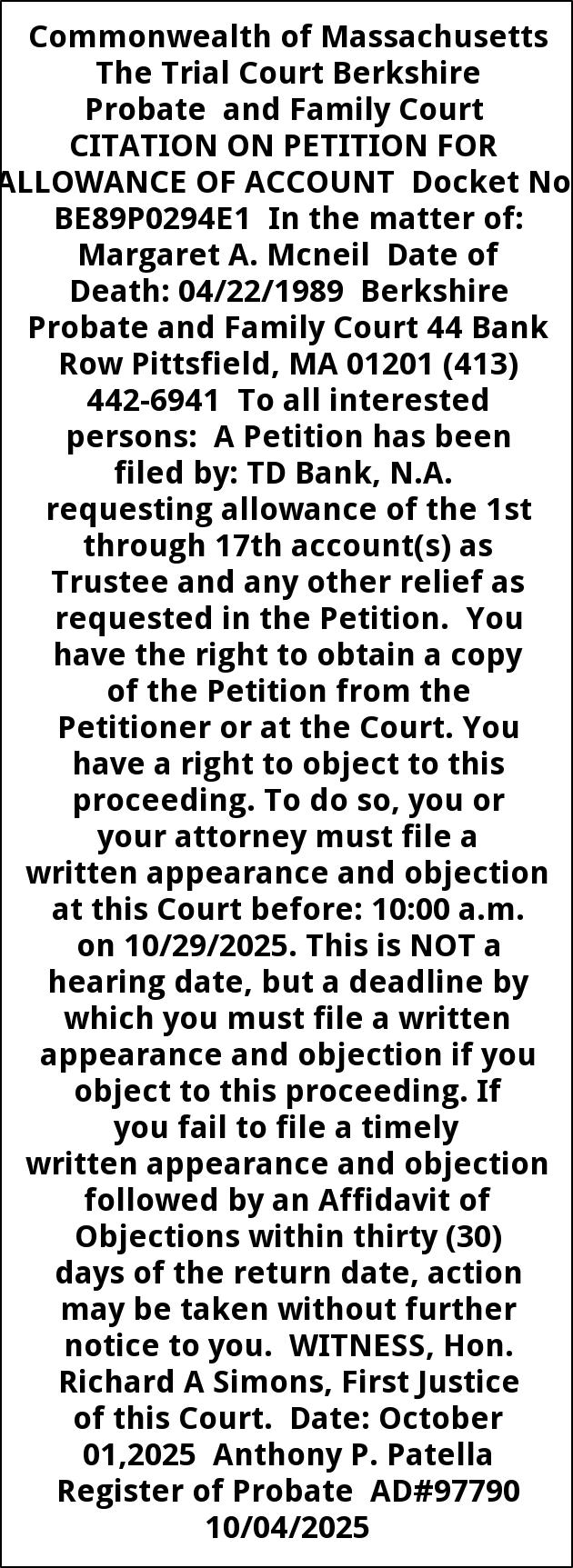 Commonwealth of Massachusetts The Trial Court Berkshire Probate and Family Court CITATION ON PETITION FOR ALLOWANCE OF ACCOUNT Docket No. BE89P0294E1 In the matter of: Margaret A. Mcneil Date of Death: 04/22/1989 Berkshire Probate and Family Court 44 Bank Row Pittsfield, MA 01201 (413) 442-6941 To all interested persons: A Petition has been filed by: TD Bank, N.A. requesting allowance of the 1st through 17th account(s) as Trustee and any other relief as requested in the Petition. You have the right to obtain a copy of the Petition from the Petitioner or at the Court. You have a right to object to this proceeding. To do so, you or your attorney must file a written appearance and objection at this Court before: 10:00 a.m. on 10/29/2025. This is NOT a hearing date, but a deadline by which you must file a written appearance and objection if you object to this proceeding. If you fail to file a timely written appearance and objection followed by an Affidavit of Objections within thirty (30) days of the return date, action may be taken without further notice to you. WITNESS, Hon. Richard A Simons, First Justice of this Court. Date: October 01,2025 Anthony P. Patella Register of Probate AD#97790 10/04/2025