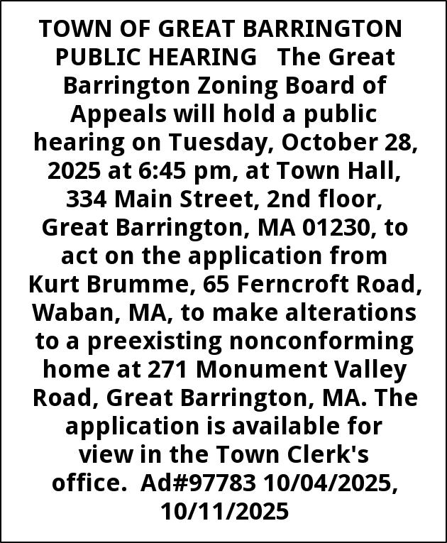 TOWN OF GREAT BARRINGTON PUBLIC HEARING The Great Barrington Zoning Board of Appeals will hold a public hearing on Tuesday, October 28, 2025 at 6:45 pm, at Town Hall, 334 Main Street, 2nd floor, Great Barrington, MA 01230, to act on the application from Kurt Brumme, 65 Ferncroft Road, Waban, MA, to make alterations to a preexisting nonconforming home at 271 Monument Valley Road, Great Barrington, MA. The application is available for view in the Town Clerk's office. Ad#97783 10/04/2025, 10/11/2025