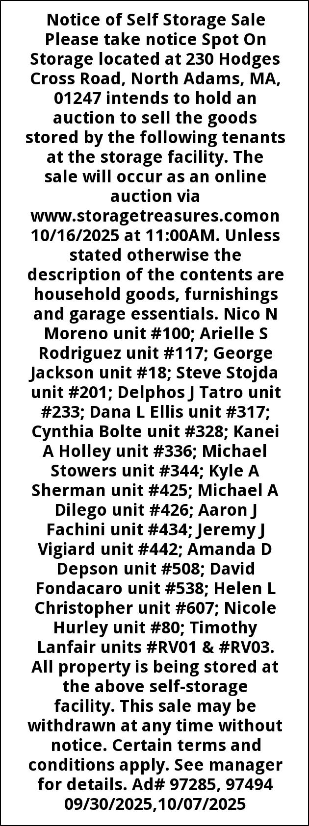 Notice of Self Storage Sale Please take notice Spot On Storage located at 230 Hodges Cross Road, North Adams, MA, 01247 intends to hold an auction to sell the goods stored by the following tenants at the storage facility. The sale will occur as an online auction via www.storagetreasures.comon 10/16/2025 at 11:00AM. Unless stated otherwise the description of the contents are household goods, furnishings and garage essentials. Nico N Moreno unit #100; Arielle S Rodriguez unit #117; George Jackson unit #18; Steve Stojda unit #201; Delphos J Tatro unit #233; Dana L Ellis unit #317; Cynthia Bolte unit #328; Kanei A Holley unit #336; Michael Stowers unit #344; Kyle A Sherman unit #425; Michael A Dilego unit #426; Aaron J Fachini unit #434; Jeremy J Vigiard unit #442; Amanda D Depson unit #508; David Fondacaro unit #538; Helen L Christopher unit #607; Nicole Hurley unit #80; Timothy Lanfair units #RV01 & #RV03. All property is being stored at the above self-storage facility. This sale may be withdrawn at any time without notice. Certain terms and conditions apply. See manager for details. Ad# 97285, 97494 09/30/2025,10/07/2025
