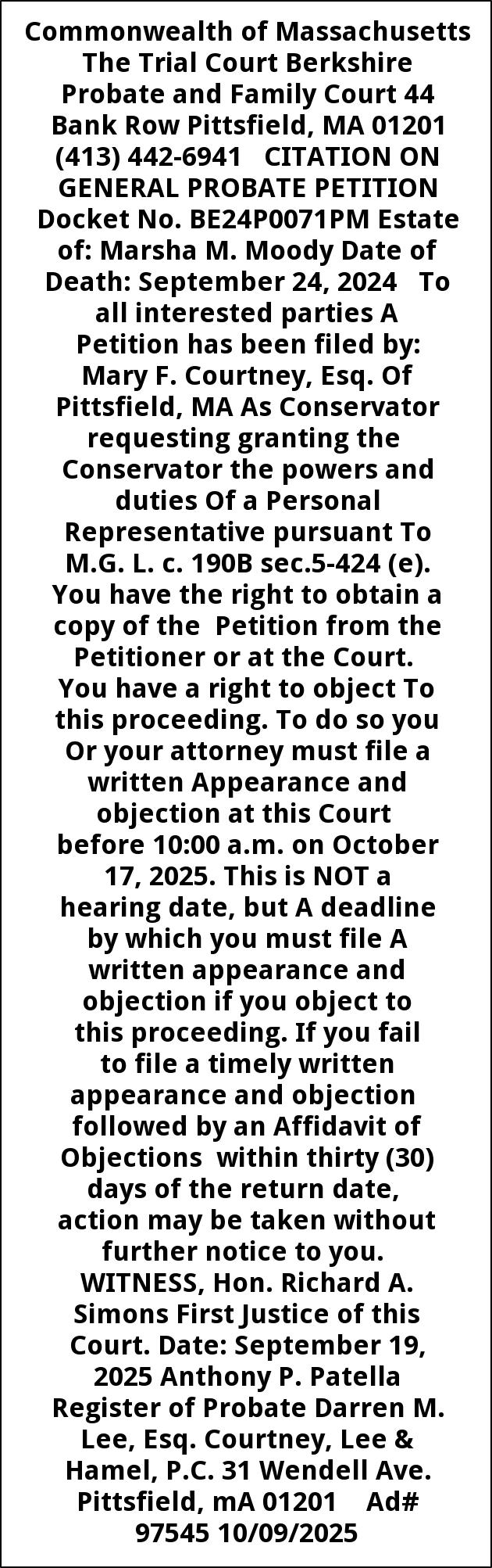 Commonwealth of Massachusetts The Trial Court Berkshire Probate and Family Court 44 Bank Row Pittsfield, MA 01201 (413) 442-6941 CITATION ON GENERAL PROBATE PETITION Docket No. BE24P0071PM Estate of: Marsha M. Moody Date of Death: September 24, 2024 To all interested parties A Petition has been filed by: Mary F. Courtney, Esq. Of Pittsfield, MA As Conservator requesting granting the Conservator the powers and duties Of a Personal Representative pursuant To M.G. L. c. 190B sec.5-424 (e). You have the right to obtain a copy of the Petition from the Petitioner or at the Court. You have a right to object To this proceeding. To do so you Or your attorney must file a written Appearance and objection at this Court before 10:00 a.m. on October 17, 2025. This is NOT a hearing date, but A deadline by which you must file A written appearance and objection if you object to this proceeding. If you fail to file a timely written appearance and objection followed by an Affidavit of Objections within thirty (30) days of the return date, action may be taken without further notice to you. WITNESS, Hon. Richard A. Simons First Justice of this Court. Date: September 19, 2025 Anthony P. Patella Register of Probate Darren M. Lee, Esq. Courtney, Lee & Hamel, P.C. 31 Wendell Ave. Pittsfield, mA 01201 Ad# 97545 10/09/2025