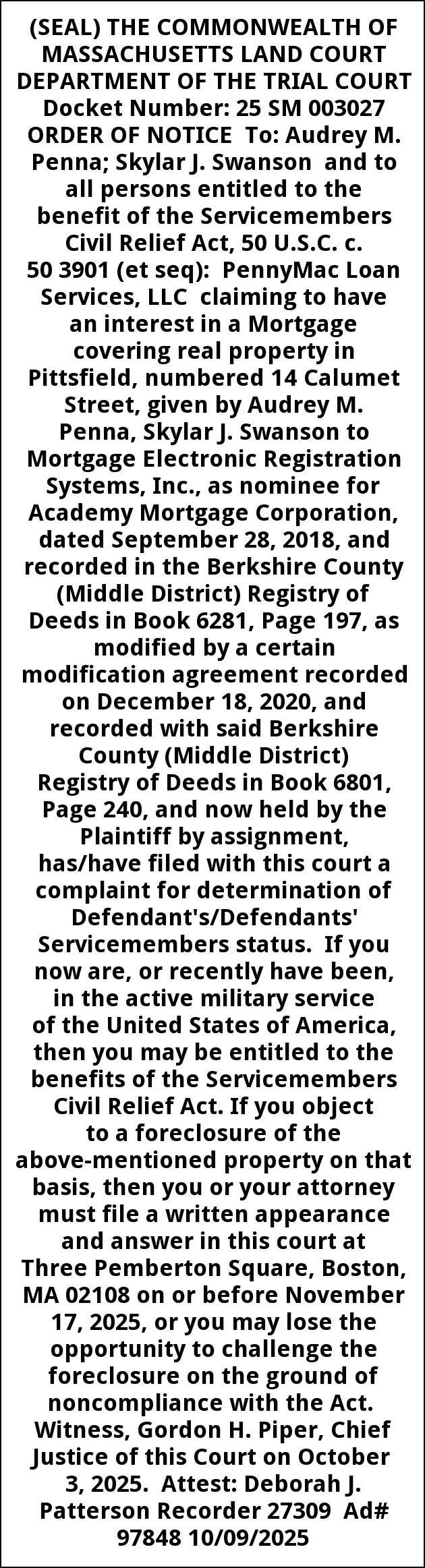 (SEAL) THE COMMONWEALTH OF MASSACHUSETTS LAND COURT DEPARTMENT OF THE TRIAL COURT Docket Number: 25 SM 003027 ORDER OF NOTICE To: Audrey M. Penna; Skylar J. Swanson and to all persons entitled to the benefit of the Servicemembers Civil Relief Act, 50 U.S.C. c. 50 3901 (et seq): PennyMac Loan Services, LLC claiming to have an interest in a Mortgage covering real property in Pittsfield, numbered 14 Calumet Street, given by Audrey M. Penna, Skylar J. Swanson to Mortgage Electronic Registration Systems, Inc., as nominee for Academy Mortgage Corporation, dated September 28, 2018, and recorded in the Berkshire County (Middle District) Registry of Deeds in Book 6281, Page 197, as modified by a certain modification agreement recorded on December 18, 2020, and recorded with said Berkshire County (Middle District) Registry of Deeds in Book 6801, Page 240, and now held by the Plaintiff by assignment, has/have filed with this court a complaint for determination of Defendant's/Defendants' Servicemembers status. If you now are, or recently have been, in the active military service of the United States of America, then you may be entitled to the benefits of the Servicemembers Civil Relief Act. If you object to a foreclosure of the above-mentioned property on that basis, then you or your attorney must file a written appearance and answer in this court at Three Pemberton Square, Boston, MA 02108 on or before November 17, 2025, or you may lose the opportunity to challenge the foreclosure on the ground of noncompliance with the Act. Witness, Gordon H. Piper, Chief Justice of this Court on October 3, 2025. Attest: Deborah J. Patterson Recorder 27309 Ad# 97848 10/09/2025