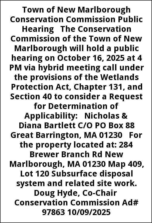 Town of New Marlborough Conservation Commission Public Hearing The Conservation Commission of the Town of New Marlborough will hold a public hearing on October 16, 2025 at 4 PM via hybrid meeting call under the provisions of the Wetlands Protection Act, Chapter 131, and Section 40 to consider a Request for Determination of Applicability: Nicholas & Diana Bartlett C/O PO Box 88 Great Barrington, MA 01230 For the property located at: 284 Brewer Branch Rd New Marlborough, MA 01230 Map 409, Lot 120 Subsurface disposal system and related site work. Doug Hyde, Co-Chair Conservation Commission Ad# 97863 10/09/2025
