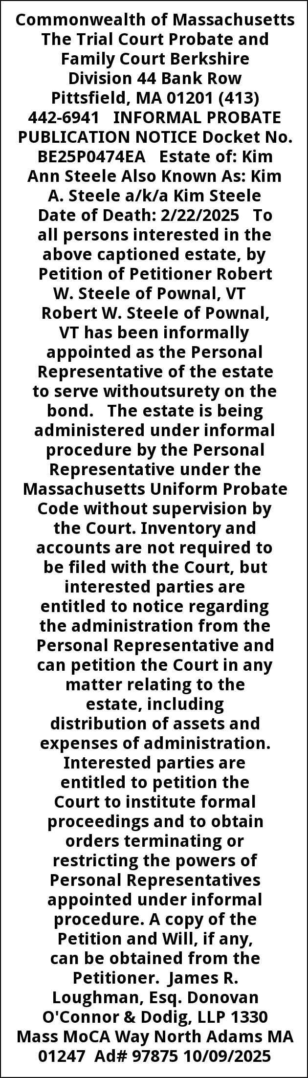 Commonwealth of Massachusetts The Trial Court Probate and Family Court Berkshire Division 44 Bank Row Pittsfield, MA 01201 (413) 442-6941 INFORMAL PROBATE PUBLICATION NOTICE Docket No. BE25P0474EA Estate of: Kim Ann Steele Also Known As: Kim A. Steele a/k/a Kim Steele Date of Death: 2/22/2025 To all persons interested in the above captioned estate, by Petition of Petitioner Robert W. Steele of Pownal, VT Robert W. Steele of Pownal, VT has been informally appointed as the Personal Representative of the estate to serve withoutsurety on the bond. The estate is being administered under informal procedure by the Personal Representative under the Massachusetts Uniform Probate Code without supervision by the Court. Inventory and accounts are not required to be filed with the Court, but interested parties are entitled to notice regarding the administration from the Personal Representative and can petition the Court in any matter relating to the estate, including distribution of assets and expenses of administration. Interested parties are entitled to petition the Court to institute formal proceedings and to obtain orders terminating or restricting the powers of Personal Representatives appointed under informal procedure. A copy of the Petition and Will, if any, can be obtained from the Petitioner. James R. Loughman, Esq. Donovan O'Connor & Dodig, LLP 1330 Mass MoCA Way North Adams MA 01247 Ad# 97875 10/09/2025