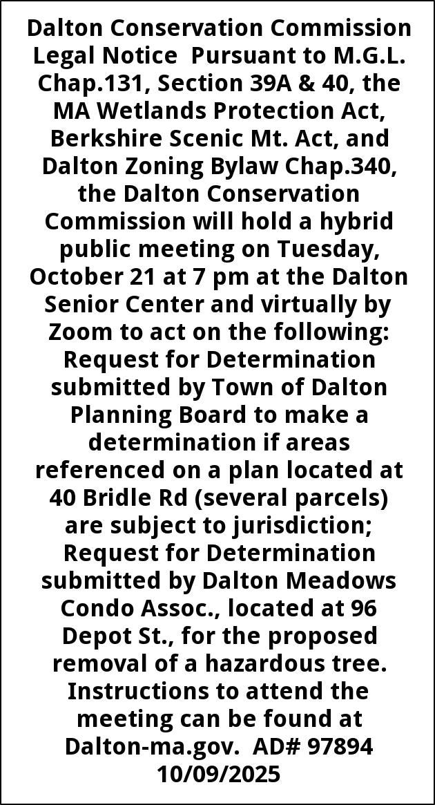 Dalton Conservation Commission Legal Notice Pursuant to M.G.L. Chap.131, Section 39A & 40, the MA Wetlands Protection Act, Berkshire Scenic Mt. Act, and Dalton Zoning Bylaw Chap.340, the Dalton Conservation Commission will hold a hybrid public meeting on Tuesday, October 21 at 7 pm at the Dalton Senior Center and virtually by Zoom to act on the following: Request for Determination submitted by Town of Dalton Planning Board to make a determination if areas referenced on a plan located at 40 Bridle Rd (several parcels) are subject to jurisdiction; Request for Determination submitted by Dalton Meadows Condo Assoc., located at 96 Depot St., for the proposed removal of a hazardous tree. Instructions to attend the meeting can be found at Dalton-ma.gov. AD# 97894 10/09/2025