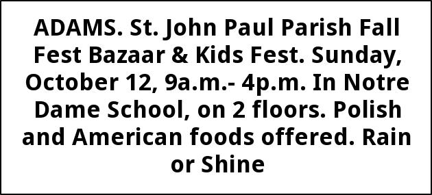 ADAMS. St. John Paul Parish Fall Fest Bazaar & Kids Fest. Sunday, October 12, 9a.m.- 4p.m. In Notre Dame School, on 2 floors. Polish and American foods offered. Rain or Shine