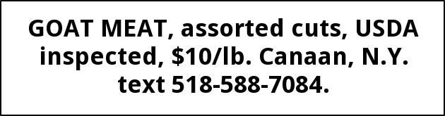 GOAT MEAT, assorted cuts, USDA inspected, $10/lb. Canaan, N.Y. text 518-588-7084.