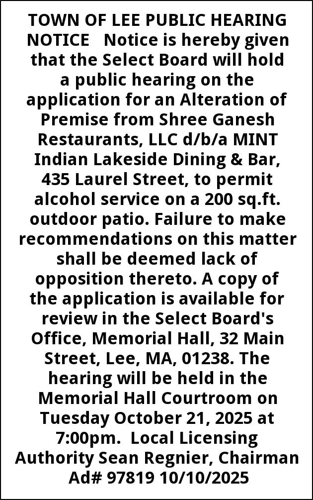 TOWN OF LEE PUBLIC HEARING NOTICE Notice is hereby given that the Select Board will hold a public hearing on the application for an Alteration of Premise from Shree Ganesh Restaurants, LLC d/b/a MINT Indian Lakeside Dining & Bar, 435 Laurel Street, to permit alcohol service on a 200 sq.ft. outdoor patio. Failure to make recommendations on this matter shall be deemed lack of opposition thereto. A copy of the application is available for review in the Select Board's Office, Memorial Hall, 32 Main Street, Lee, MA, 01238. The hearing will be held in the Memorial Hall Courtroom on Tuesday October 21, 2025 at 7:00pm. Local Licensing Authority Sean Regnier, Chairman Ad# 97819 10/10/2025