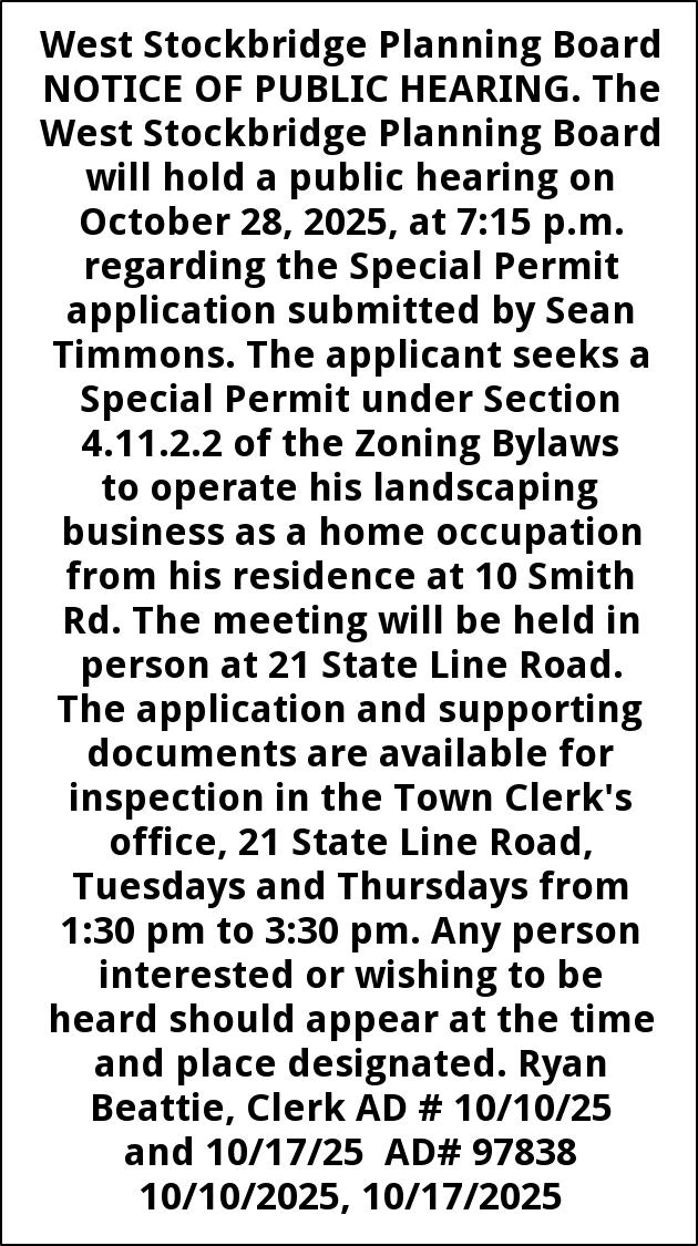 West Stockbridge Planning Board NOTICE OF PUBLIC HEARING. The West Stockbridge Planning Board will hold a public hearing on October 28, 2025, at 7:15 p.m. regarding the Special Permit application submitted by Sean Timmons. The applicant seeks a Special Permit under Section 4.11.2.2 of the Zoning Bylaws to operate his landscaping business as a home occupation from his residence at 10 Smith Rd. The meeting will be held in person at 21 State Line Road. The application and supporting documents are available for inspection in the Town Clerk's office, 21 State Line Road, Tuesdays and Thursdays from 1:30 pm to 3:30 pm. Any person interested or wishing to be heard should appear at the time and place designated. Ryan Beattie, Clerk AD # 10/10/25 and 10/17/25 AD# 97838 10/10/2025, 10/17/2025