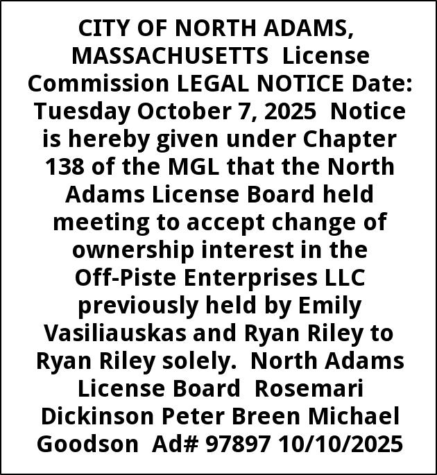 CITY OF NORTH ADAMS, MASSACHUSETTS License Commission LEGAL NOTICE Date: Tuesday October 7, 2025 Notice is hereby given under Chapter 138 of the MGL that the North Adams License Board held meeting to accept change of ownership interest in the Off-Piste Enterprises LLC previously held by Emily Vasiliauskas and Ryan Riley to Ryan Riley solely. North Adams License Board Rosemari Dickinson Peter Breen Michael Goodson Ad# 97897 10/10/2025