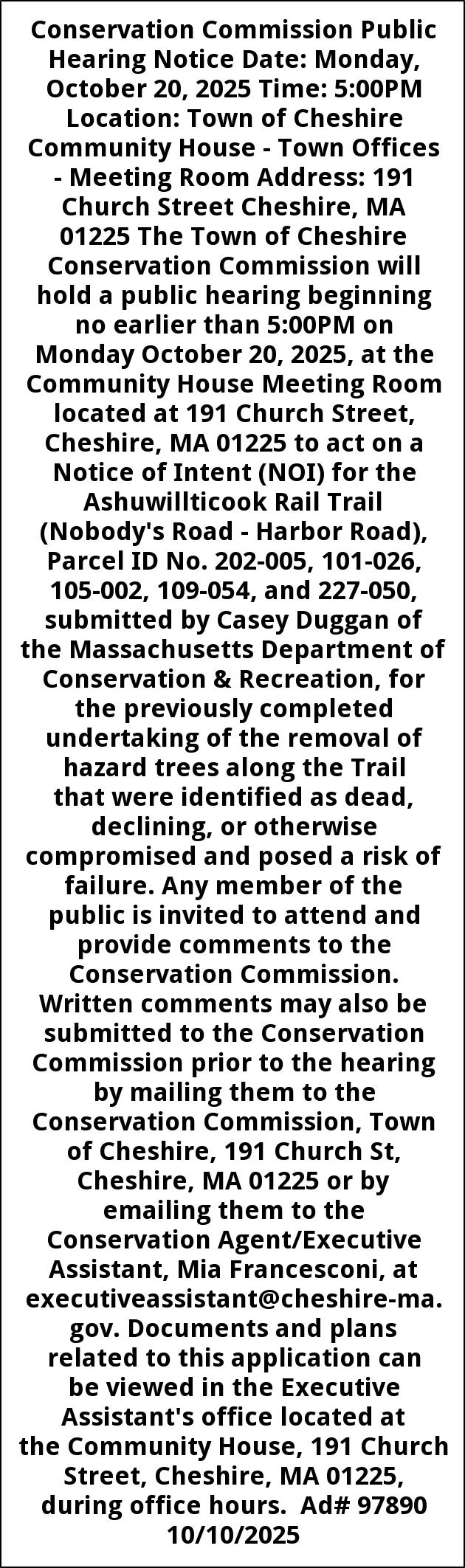 Conservation Commission Public Hearing Notice Date: Monday, October 20, 2025 Time: 5:00PM Location: Town of Cheshire Community House - Town Offices - Meeting Room Address: 191 Church Street Cheshire, MA 01225 The Town of Cheshire Conservation Commission will hold a public hearing beginning no earlier than 5:00PM on Monday October 20, 2025, at the Community House Meeting Room located at 191 Church Street, Cheshire, MA 01225 to act on a Notice of Intent (NOI) for the Ashuwillticook Rail Trail (Nobody's Road - Harbor Road), Parcel ID No. 202-005, 101-026, 105-002, 109-054, and 227-050, submitted by Casey Duggan of the Massachusetts Department of Conservation & Recreation, for the previously completed undertaking of the removal of hazard trees along the Trail that were identified as dead, declining, or otherwise compromised and posed a risk of failure. Any member of the public is invited to attend and provide comments to the Conservation Commission. Written comments may also be submitted to the Conservation Commission prior to the hearing by mailing them to the Conservation Commission, Town of Cheshire, 191 Church St, Cheshire, MA 01225 or by emailing them to the Conservation Agent/Executive Assistant, Mia Francesconi, at executiveassistant@cheshire-ma.gov. Documents and plans related to this application can be viewed in the Executive Assistant's office located at the Community House, 191 Church Street, Cheshire, MA 01225, during office hours. Ad# 97890 10/10/2025