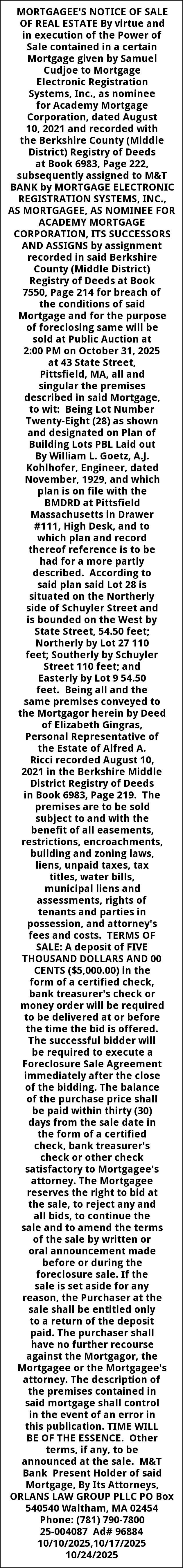MORTGAGEE'S NOTICE OF SALE OF REAL ESTATE By virtue and in execution of the Power of Sale contained in a certain Mortgage given by Samuel Cudjoe to Mortgage Electronic Registration Systems, Inc., as nominee for Academy Mortgage Corporation, dated August 10, 2021 and recorded with the Berkshire County (Middle District) Registry of Deeds at Book 6983, Page 222, subsequently assigned to M&T BANK by MORTGAGE ELECTRONIC REGISTRATION SYSTEMS, INC., AS MORTGAGEE, AS NOMINEE FOR ACADEMY MORTGAGE CORPORATION, ITS SUCCESSORS AND ASSIGNS by assignment recorded in said Berkshire County (Middle District) Registry of Deeds at Book 7550, Page 214 for breach of the conditions of said Mortgage and for the purpose of foreclosing same will be sold at Public Auction at 2:00 PM on October 31, 2025 at 43 State Street, Pittsfield, MA, all and singular the premises described in said Mortgage, to wit: Being Lot Number Twenty-Eight (28) as shown and designated on Plan of Building Lots PBL Laid out By William L. Goetz, A.J. Kohlhofer, Engineer, dated November, 1929, and which plan is on file with the BMDRD at Pittsfield Massachusetts in Drawer #111, High Desk, and to which plan and record thereof reference is to be had for a more partly described. According to said plan said Lot 28 is situated on the Northerly side of Schuyler Street and is bounded on the West by State Street, 54.50 feet; Northerly by Lot 27 110 feet; Southerly by Schuyler Street 110 feet; and Easterly by Lot 9 54.50 feet. Being all and the same premises conveyed to the Mortgagor herein by Deed of Elizabeth Gingras, Personal Representative of the Estate of Alfred A. Ricci recorded August 10, 2021 in the Berkshire Middle District Registry of Deeds in Book 6983, Page 219. The premises are to be sold subject to and with the benefit of all easements, restrictions, encroachments, building and zoning laws, liens, unpaid taxes, tax titles, water bills, municipal liens and assessments, rights of tenants and parties in possession, and attorney's fees and costs. TERMS OF SALE: A deposit of FIVE THOUSAND DOLLARS AND 00 CENTS ($5,000.00) in the form of a certified check, bank treasurer's check or money order will be required to be delivered at or before the time the bid is offered. The successful bidder will be required to execute a Foreclosure Sale Agreement immediately after the close of the bidding. The balance of the purchase price shall be paid within thirty (30) days from the sale date in the form of a certified check, bank treasurer's check or other check satisfactory to Mortgagee's attorney. The Mortgagee reserves the right to bid at the sale, to reject any and all bids, to continue the sale and to amend the terms of the sale by written or oral announcement made before or during the foreclosure sale. If the sale is set aside for any reason, the Purchaser at the sale shall be entitled only to a return of the deposit paid. The purchaser shall have no further recourse against the Mortgagor, the Mortgagee or the Mortgagee's attorney. The description of the premises contained in said mortgage shall control in the event of an error in this publication. TIME WILL BE OF THE ESSENCE. Other terms, if any, to be announced at the sale. M&T Bank Present Holder of said Mortgage, By Its Attorneys, ORLANS LAW GROUP PLLC PO Box 540540 Waltham, MA 02454 Phone: (781) 790-7800 25-004087 Ad# 96884 10/10/2025,10/17/2025 10/24/2025