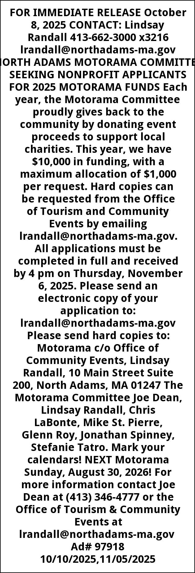 FOR IMMEDIATE RELEASE October 8, 2025 CONTACT: Lindsay Randall 413-662-3000 x3216 lrandall@northadams-ma.gov NORTH ADAMS MOTORAMA COMMITTEE SEEKING NONPROFIT APPLICANTS FOR 2025 MOTORAMA FUNDS Each year, the Motorama Committee proudly gives back to the community by donating event proceeds to support local charities. This year, we have $10,000 in funding, with a maximum allocation of $1,000 per request. Hard copies can be requested from the Office of Tourism and Community Events by emailing lrandall@northadams-ma.gov. All applications must be completed in full and received by 4 pm on Thursday, November 6, 2025. Please send an electronic copy of your application to: lrandall@northadams-ma.gov Please send hard copies to: Motorama c/o Office of Community Events, Lindsay Randall, 10 Main Street Suite 200, North Adams, MA 01247 The Motorama Committee Joe Dean, Lindsay Randall, Chris LaBonte, Mike St. Pierre, Glenn Roy, Jonathan Spinney, Stefanie Tatro. Mark your calendars! NEXT Motorama Sunday, August 30, 2026! For more information contact Joe Dean at (413) 346-4777 or the Office of Tourism & Community Events at lrandall@northadams-ma.gov Ad# 97918 10/10/2025,11/05/2025