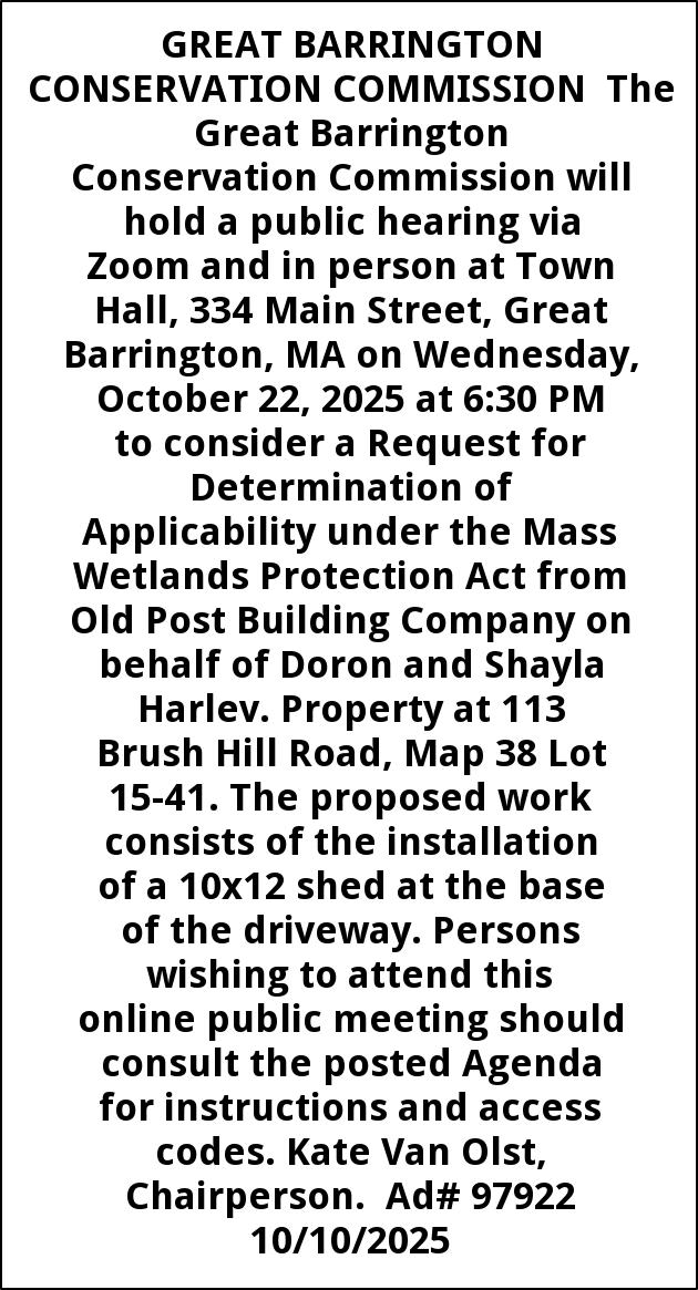 GREAT BARRINGTON CONSERVATION COMMISSION The Great Barrington Conservation Commission will hold a public hearing via Zoom and in person at Town Hall, 334 Main Street, Great Barrington, MA on Wednesday, October 22, 2025 at 6:30 PM to consider a Request for Determination of Applicability under the Mass Wetlands Protection Act from Old Post Building Company on behalf of Doron and Shayla Harlev. Property at 113 Brush Hill Road, Map 38 Lot 15-41. The proposed work consists of the installation of a 10x12 shed at the base of the driveway. Persons wishing to attend this online public meeting should consult the posted Agenda for instructions and access codes. Kate Van Olst, Chairperson. Ad# 97922 10/10/2025