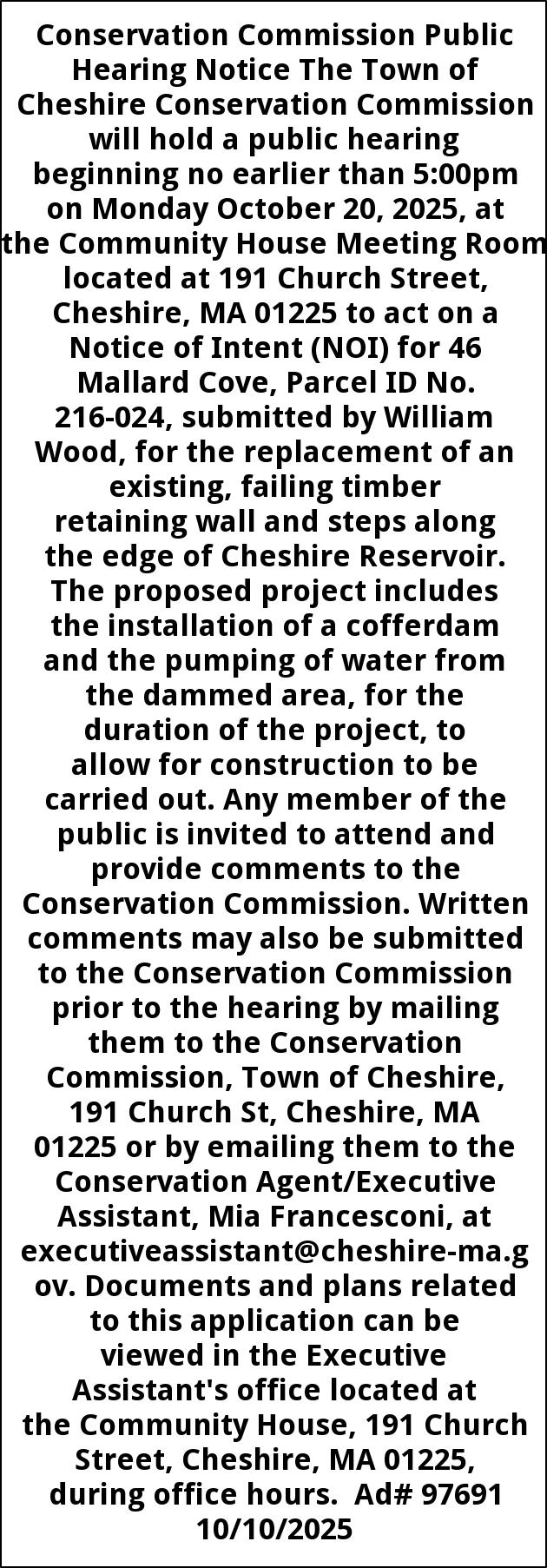 Conservation Commission Public Hearing Notice The Town of Cheshire Conservation Commission will hold a public hearing beginning no earlier than 5:00pm on Monday October 20, 2025, at the Community House Meeting Room located at 191 Church Street, Cheshire, MA 01225 to act on a Notice of Intent (NOI) for 46 Mallard Cove, Parcel ID No. 216-024, submitted by William Wood, for the replacement of an existing, failing timber retaining wall and steps along the edge of Cheshire Reservoir. The proposed project includes the installation of a cofferdam and the pumping of water from the dammed area, for the duration of the project, to allow for construction to be carried out. Any member of the public is invited to attend and provide comments to the Conservation Commission. Written comments may also be submitted to the Conservation Commission prior to the hearing by mailing them to the Conservation Commission, Town of Cheshire, 191 Church St, Cheshire, MA 01225 or by emailing them to the Conservation Agent/Executive Assistant, Mia Francesconi, at executiveassistant@cheshire-ma.gov. Documents and plans related to this application can be viewed in the Executive Assistant's office located at the Community House, 191 Church Street, Cheshire, MA 01225, during office hours. Ad# 97691 10/10/2025