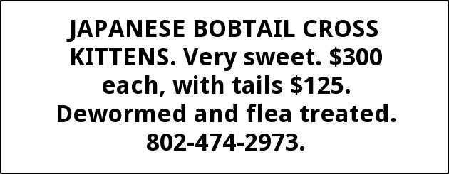 JAPANESE BOBTAIL CROSS KITTENS. Very sweet. $300 each, with tails $125. Dewormed and flea treated. 802-474-2973.