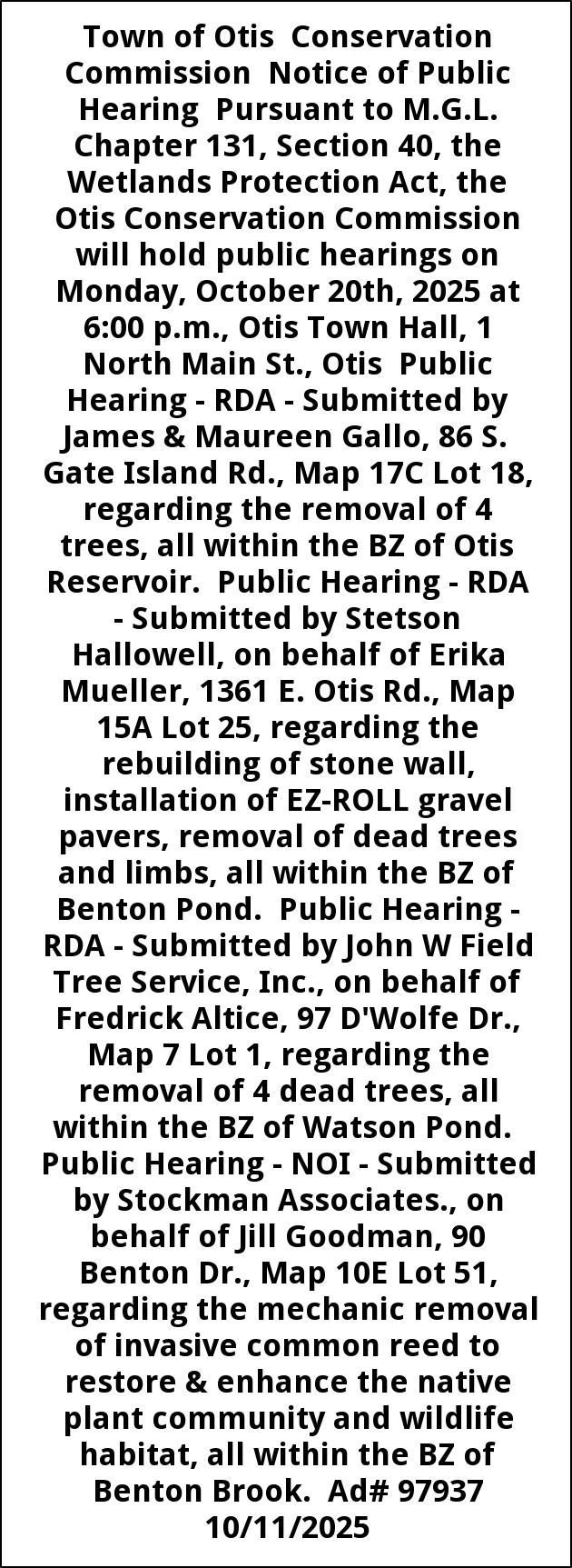 Town of Otis Conservation Commission Notice of Public Hearing Pursuant to M.G.L. Chapter 131, Section 40, the Wetlands Protection Act, the Otis Conservation Commission will hold public hearings on Monday, October 20th, 2025 at 6:00 p.m., Otis Town Hall, 1 North Main St., Otis Public Hearing - RDA - Submitted by James & Maureen Gallo, 86 S. Gate Island Rd., Map 17C Lot 18, regarding the removal of 4 trees, all within the BZ of Otis Reservoir. Public Hearing - RDA - Submitted by Stetson Hallowell, on behalf of Erika Mueller, 1361 E. Otis Rd., Map 15A Lot 25, regarding the rebuilding of stone wall, installation of EZ-ROLL gravel pavers, removal of dead trees and limbs, all within the BZ of Benton Pond. Public Hearing - RDA - Submitted by John W Field Tree Service, Inc., on behalf of Fredrick Altice, 97 D'Wolfe Dr., Map 7 Lot 1, regarding the removal of 4 dead trees, all within the BZ of Watson Pond. Public Hearing - NOI - Submitted by Stockman Associates., on behalf of Jill Goodman, 90 Benton Dr., Map 10E Lot 51, regarding the mechanic removal of invasive common reed to restore & enhance the native plant community and wildlife habitat, all within the BZ of Benton Brook. Ad# 97937 10/11/2025