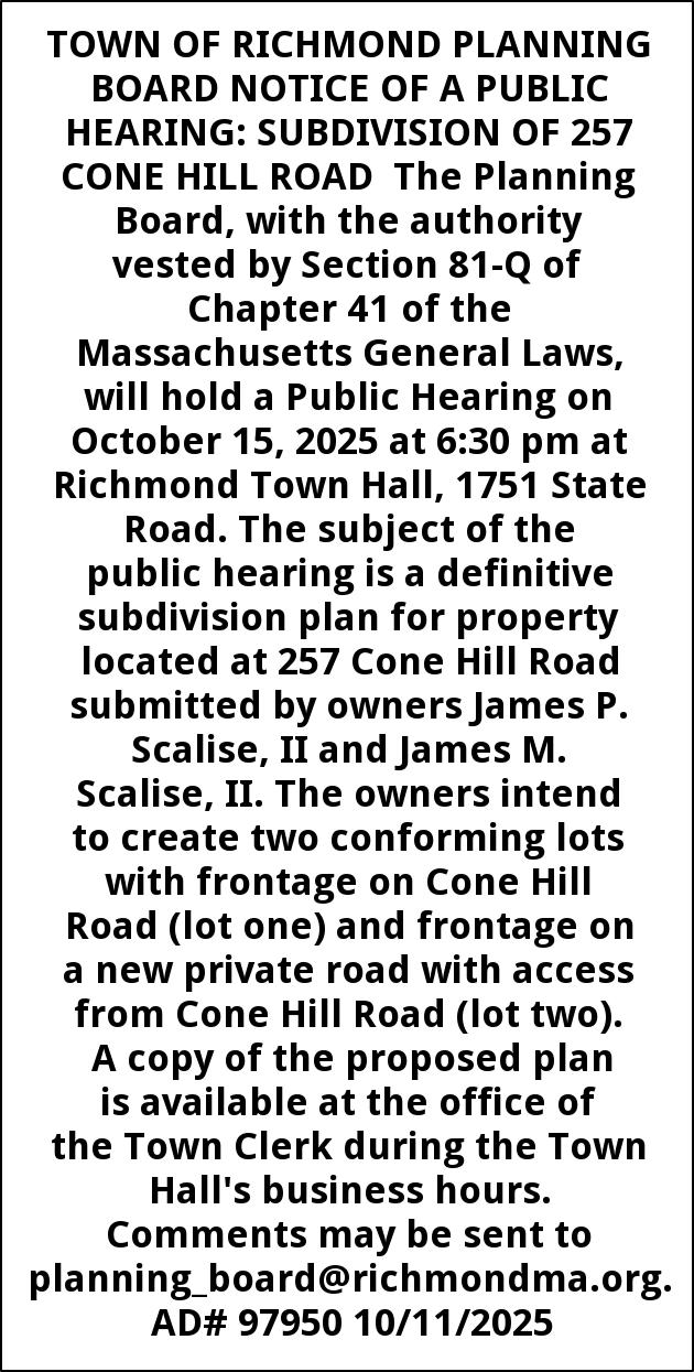TOWN OF RICHMOND PLANNING BOARD NOTICE OF A PUBLIC HEARING: SUBDIVISION OF 257 CONE HILL ROAD The Planning Board, with the authority vested by Section 81-Q of Chapter 41 of the Massachusetts General Laws, will hold a Public Hearing on October 15, 2025 at 6:30 pm at Richmond Town Hall, 1751 State Road. The subject of the public hearing is a definitive subdivision plan for property located at 257 Cone Hill Road submitted by owners James P. Scalise, II and James M. Scalise, II. The owners intend to create two conforming lots with frontage on Cone Hill Road (lot one) and frontage on a new private road with access from Cone Hill Road (lot two). A copy of the proposed plan is available at the office of the Town Clerk during the Town Hall's business hours. Comments may be sent to planning_board@richmondma.org. AD# 97950 10/11/2025
