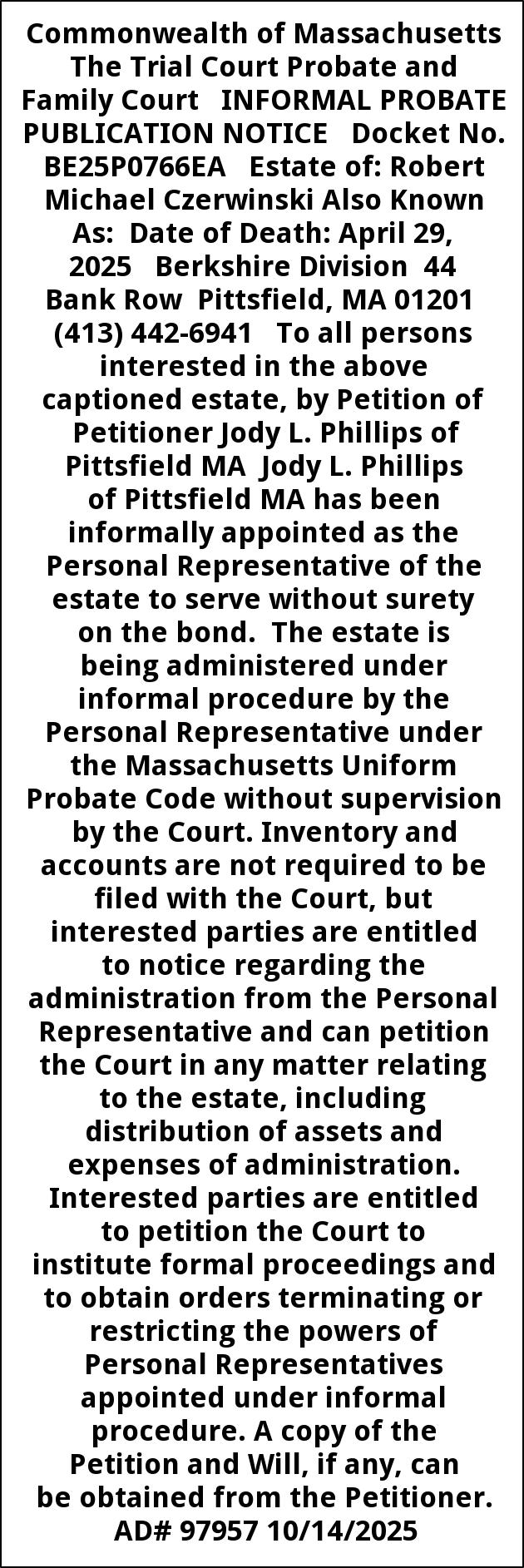 Commonwealth of Massachusetts The Trial Court Probate and Family Court INFORMAL PROBATE PUBLICATION NOTICE Docket No. BE25P0766EA Estate of: Robert Michael Czerwinski Also Known As: Date of Death: April 29, 2025 Berkshire Division 44 Bank Row Pittsfield, MA 01201 (413) 442-6941 To all persons interested in the above captioned estate, by Petition of Petitioner Jody L. Phillips of Pittsfield MA Jody L. Phillips of Pittsfield MA has been informally appointed as the Personal Representative of the estate to serve without surety on the bond. The estate is being administered under informal procedure by the Personal Representative under the Massachusetts Uniform Probate Code without supervision by the Court. Inventory and accounts are not required to be filed with the Court, but interested parties are entitled to notice regarding the administration from the Personal Representative and can petition the Court in any matter relating to the estate, including distribution of assets and expenses of administration. Interested parties are entitled to petition the Court to institute formal proceedings and to obtain orders terminating or restricting the powers of Personal Representatives appointed under informal procedure. A copy of the Petition and Will, if any, can be obtained from the Petitioner. AD# 97957 10/14/2025