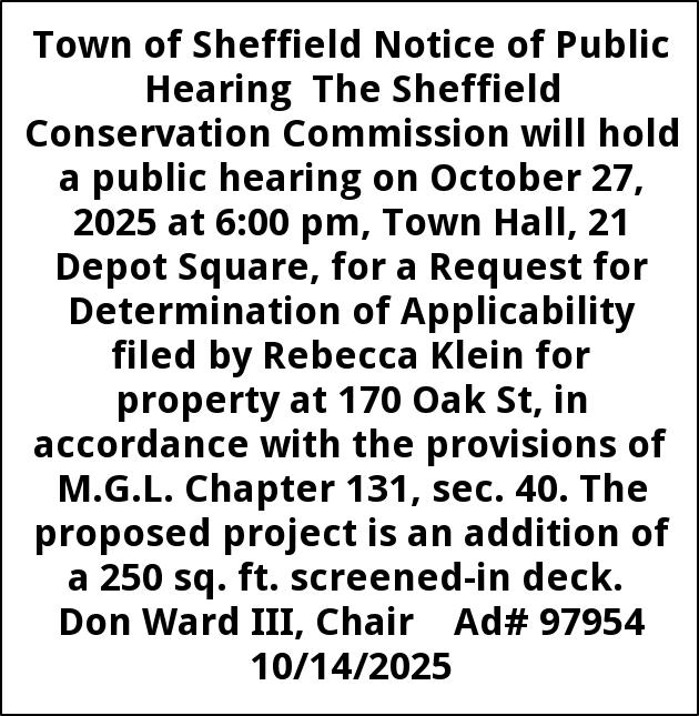 Town of Sheffield Notice of Public Hearing The Sheffield Conservation Commission will hold a public hearing on October 27, 2025 at 6:00 pm, Town Hall, 21 Depot Square, for a Request for Determination of Applicability filed by Rebecca Klein for property at 170 Oak St, in accordance with the provisions of M.G.L. Chapter 131, sec. 40. The proposed project is an addition of a 250 sq. ft. screened-in deck. Don Ward III, Chair Ad# 97954 10/14/2025